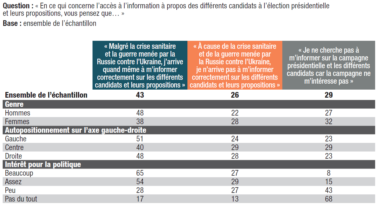 4. Il est devenu plus difficile de suivre la campagne : 26% des répondants disent ne pas parvenir à s’informer correctement sur les différents candidats et sur leurs propositions à cause de la crise sanitaire et de la guerre en Ukraine (contre 43% qui déclarent arriver quand même à s’informer correctement sur les différents candidats et leurs propositions). Près d’un tiers (29%) des personnes interrogées déclarent ne pas chercher à s’informer sur les différents candidats car la campagne présidentielle ne les intéresse pas.