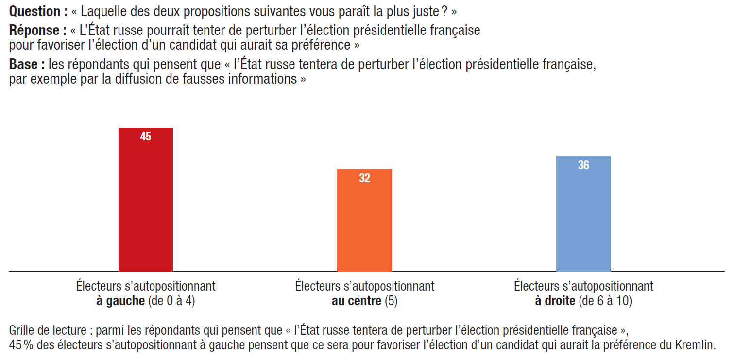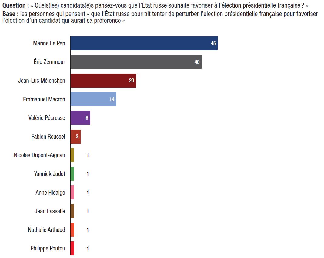8. 58% des personnes interrogées pensent que « l’État russe tentera de perturber l’élection présidentielle française, par exemple par la diffusion de fausses informations ». Parmi ceux qui le pensent, plus d’un tiers (37%) estiment que ce sera dans le but de favoriser un candidat qui aurait la préférence du Kremlin. Marine Le Pen (45%), Éric Zemmour (40%) et Jean-Luc Mélenchon (20%) sont le plus souvent considérés comme les candidats qui seraient favorisés par une telle intervention de l’État russe.