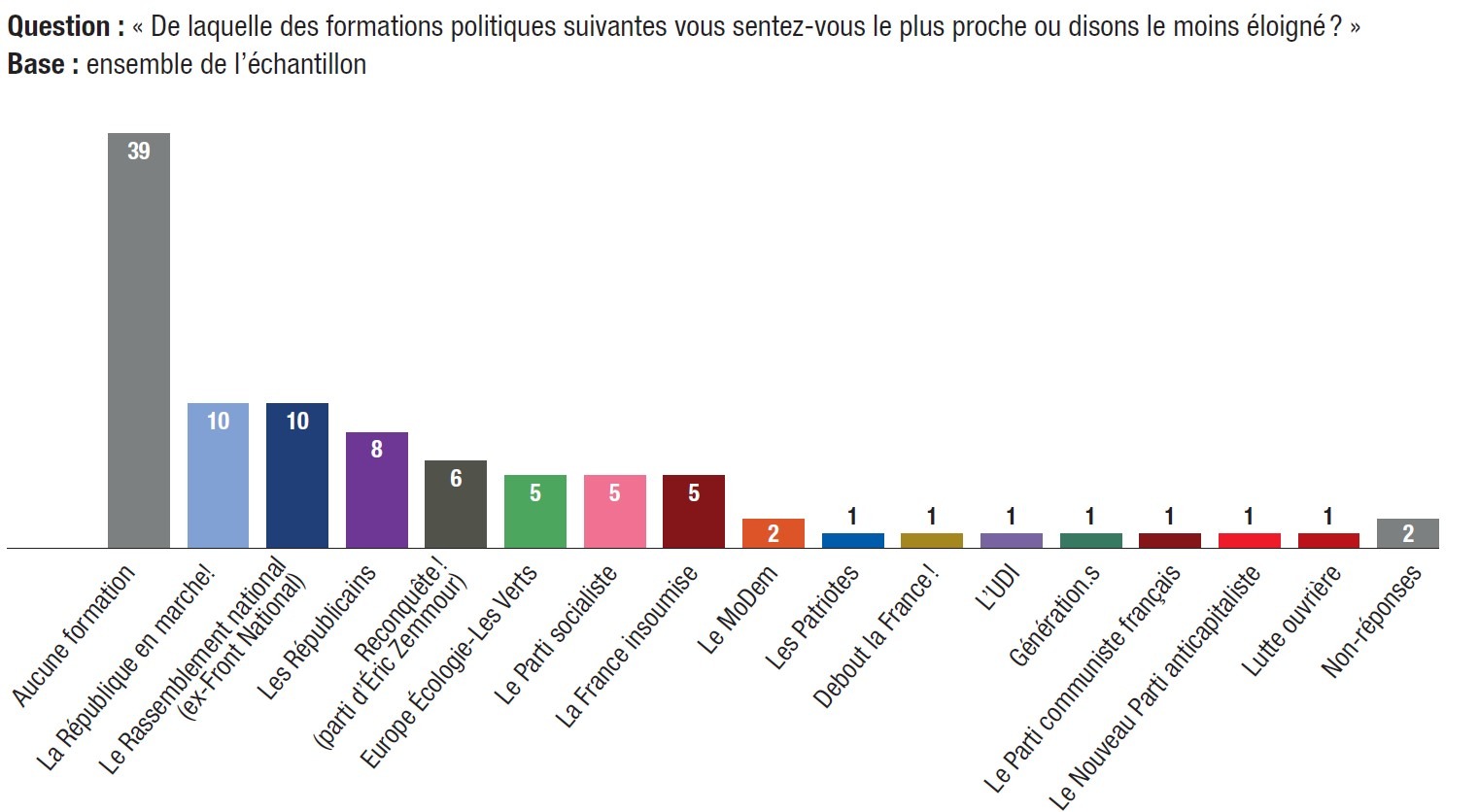 23. La désaffiliation partisane se poursuit malgré la campagne : 39% des électeurs ne déclarent pas de proximité avec un parti. LREM et le RN, les deux formations les plus populaires, suscitent respectivement l’intérêt de 10% seulement des électeurs.