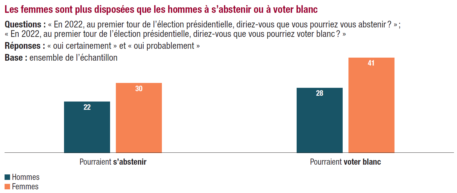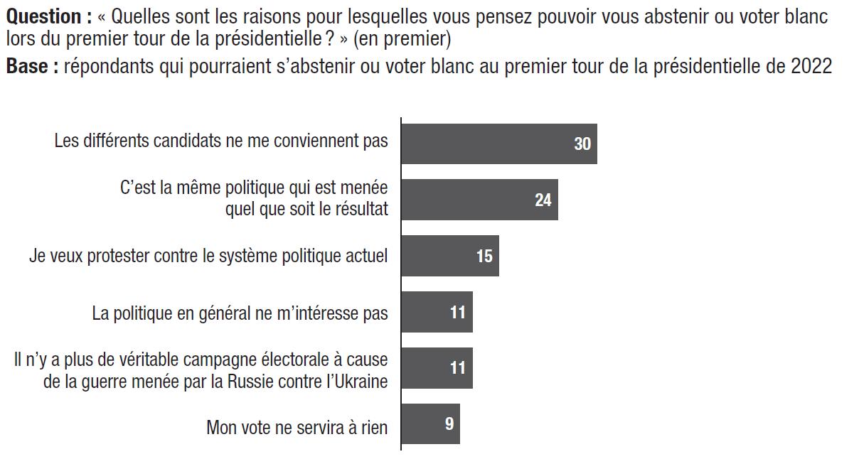 16. Les principales raisons indiquées montrent que l’abstention et le vote blanc procèdent moins d’un désintérêt pour la politique ou pour l’élection présidentielle que d’une forme de protestation. Ainsi, 30% des répondants disent qu’ils pourraient s’abstenir ou voter blanc car « les différents candidats ne leur conviennent pas », 24% car « c’est la même politique qui est menée quel que soit le résultat », 15% pour « protester contre le système actuel ». L’hypothèse selon laquelle la guerre menée par la Russie en Ukraine influence l’élection est en partie vérifiée puisqu’elle arrive en quatrième position (11%) des raisons d’une potentielle abstention ou d’un vote blanc, à égalité avec le désintérêt pour la politique (11%) et devant l’idée que son vote « ne sert à rien » (9%).