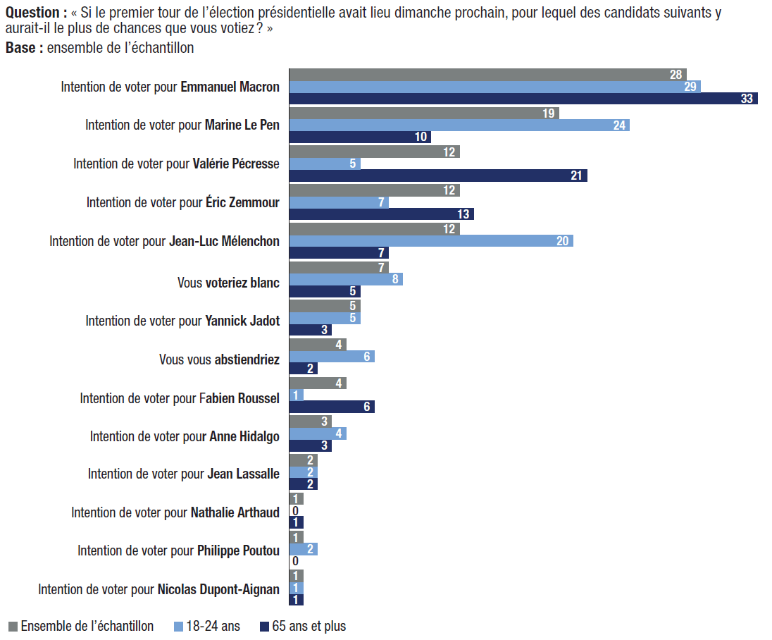 18. En cas de second tour opposant Emmanuel Macron à Marine Le Pen, 72% des électeurs pouvant voter Éric Zemmour au premier tour expriment une préférence pour Marine Le Pen, tandis que 16% des électeurs d’Éric Zemmour s’abstiendraient ou voteraient blanc et que 9% voteraient pour Emmanuel Macron.