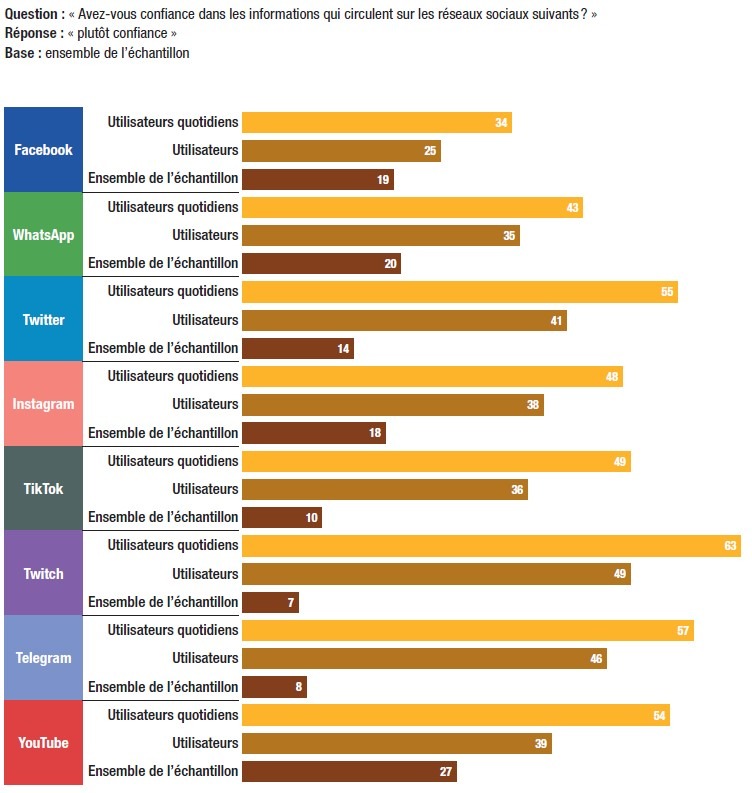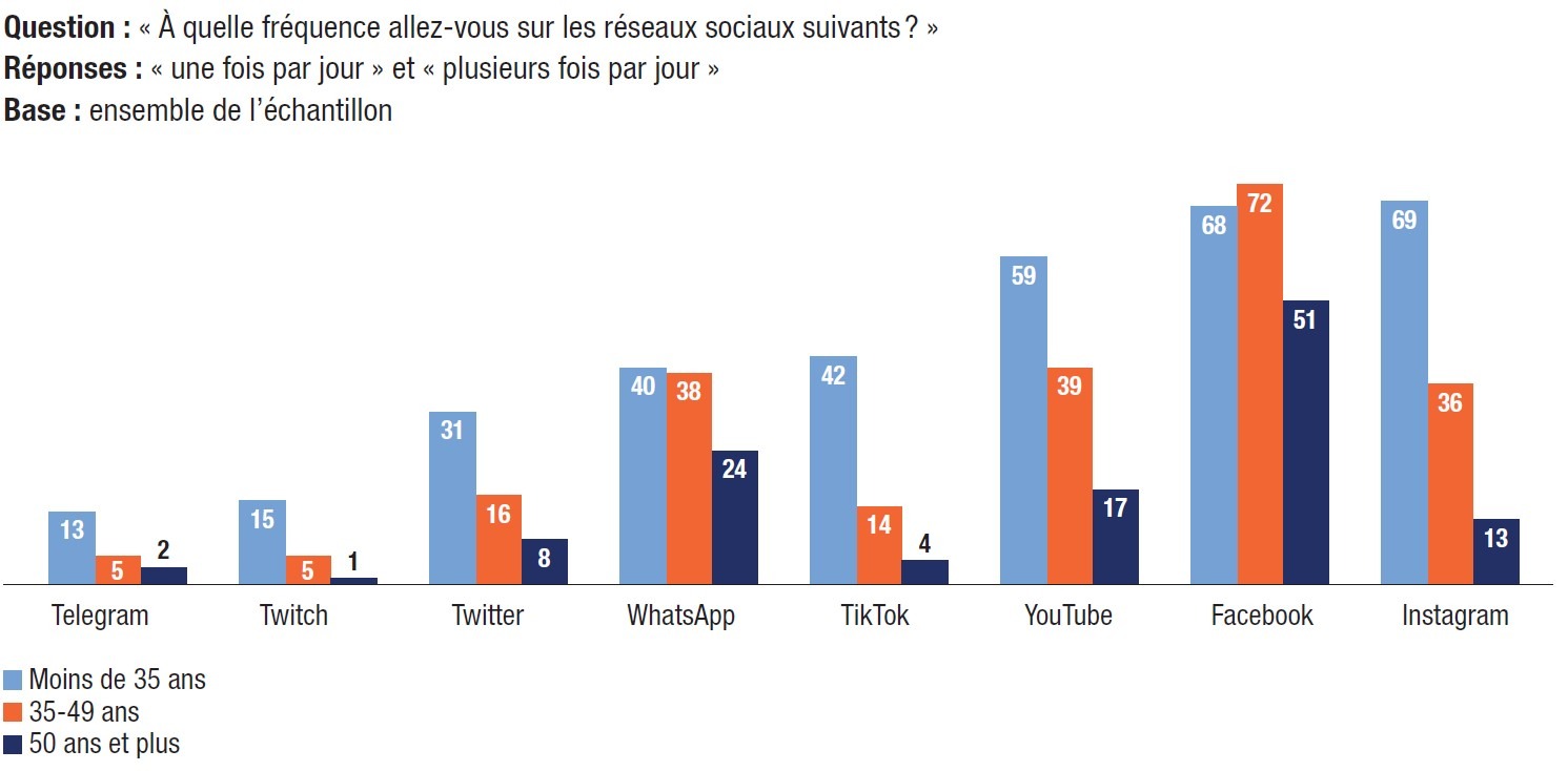 33. En moyenne, la plupart des personnes interrogées déclarent utiliser Facebook (77%) et YouTube (77%). Moins massif, l’usage de WhatsApp (59%) et d’Instagram (47%) reste très répandu. Twitter (32%) et TikTok (27%) sont moins utilisés, suivis de Twitch (15%) et de Telegram (15%). Les trois quarts des répondants (77%) indiquent utiliser un réseau social au moins une fois par jour.