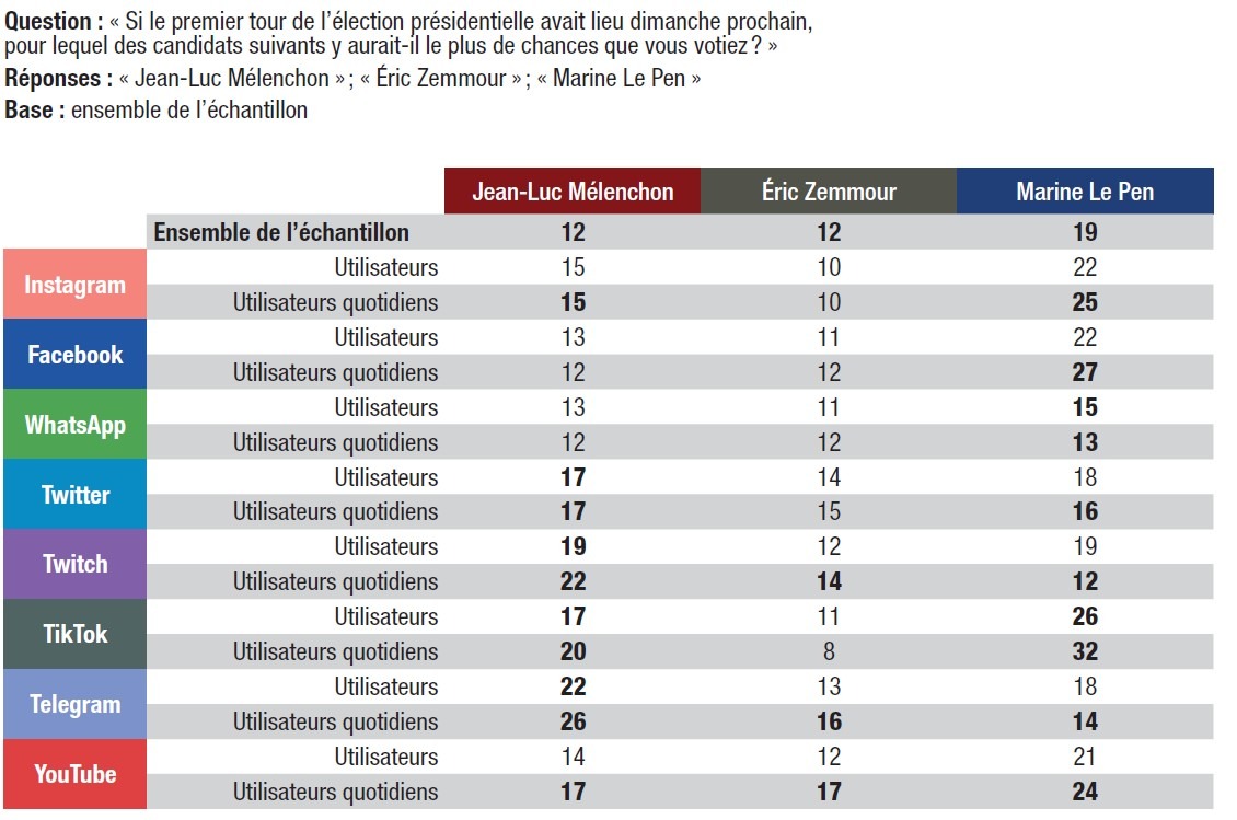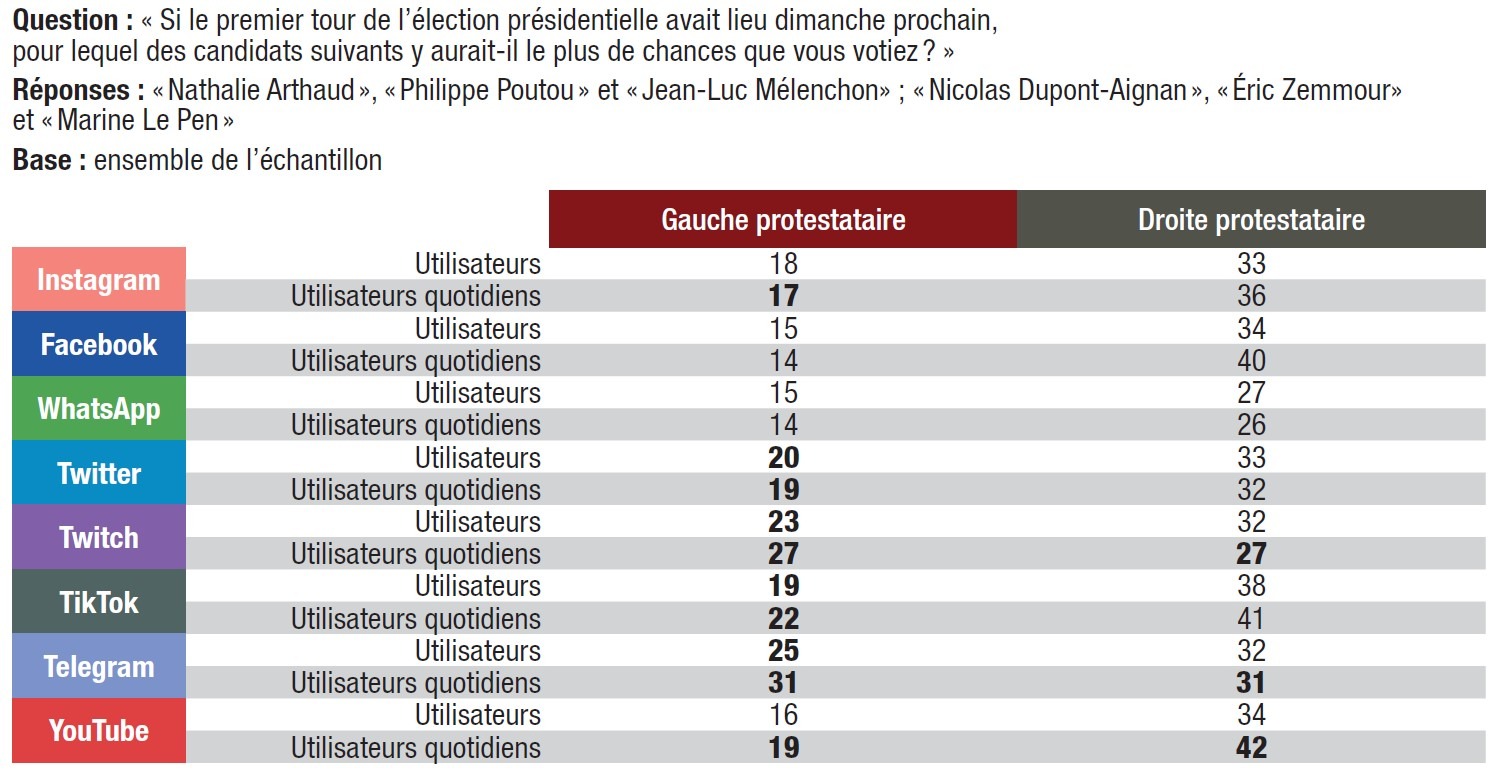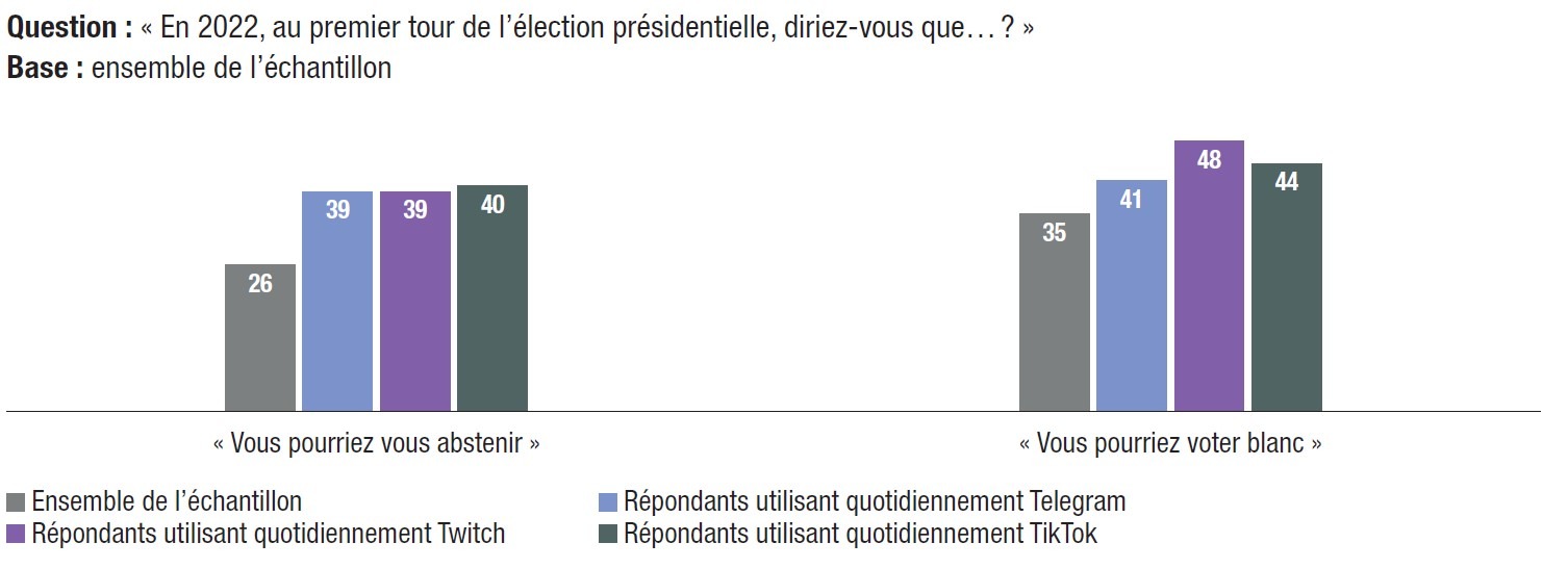 En revanche, l’utilisation quotidienne de Facebook, WhatsApp et Twitter ne semble pas avoir d’effet sur l’intention de s’abstenir ou de voter blanc au premier tour : les utilisateurs quotidiens de Facebook, WhatsApp et Twitter sont 35% à dire pouvoir voter blanc, comme la moyenne des électeurs (35%). Parmi les usagers quotidiens de Facebook, ils sont 27% à indiquer pouvoir s’abstenir, 26% parmi ceux de WhatsApp, et 28% parmi ceux de Twitter (contre 26% en moyenne). Le potentiel de protestation électorale, et plus précisément la possibilité de voter pour l’un des trois grands candidats populistes, Jean‑Luc Mélenchon, Éric Zemmour ou Marine Le Pen, est sensible à l’utilisation des réseaux sociaux, notamment des réseaux utilisés par les plus jeunes : TikTok, Twitch et Telegram.