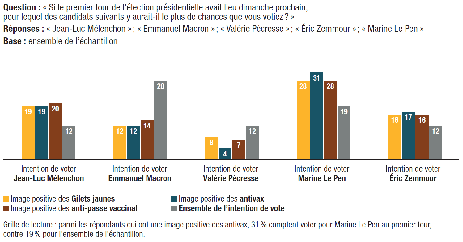 Si les antivax et les anti-passe vaccinal ne sont pas une reproduction à l’identique des Gilets jaunes, on trouve des éléments communs à ces trois mouvements, tous porteurs d’une radicalité inédite : 30% des électeurs gardent une image positive des antivax, soit trois points de plus qu’en septembre 2021 (27%), et 37% ont une image positive des anti-passe vaccinal.