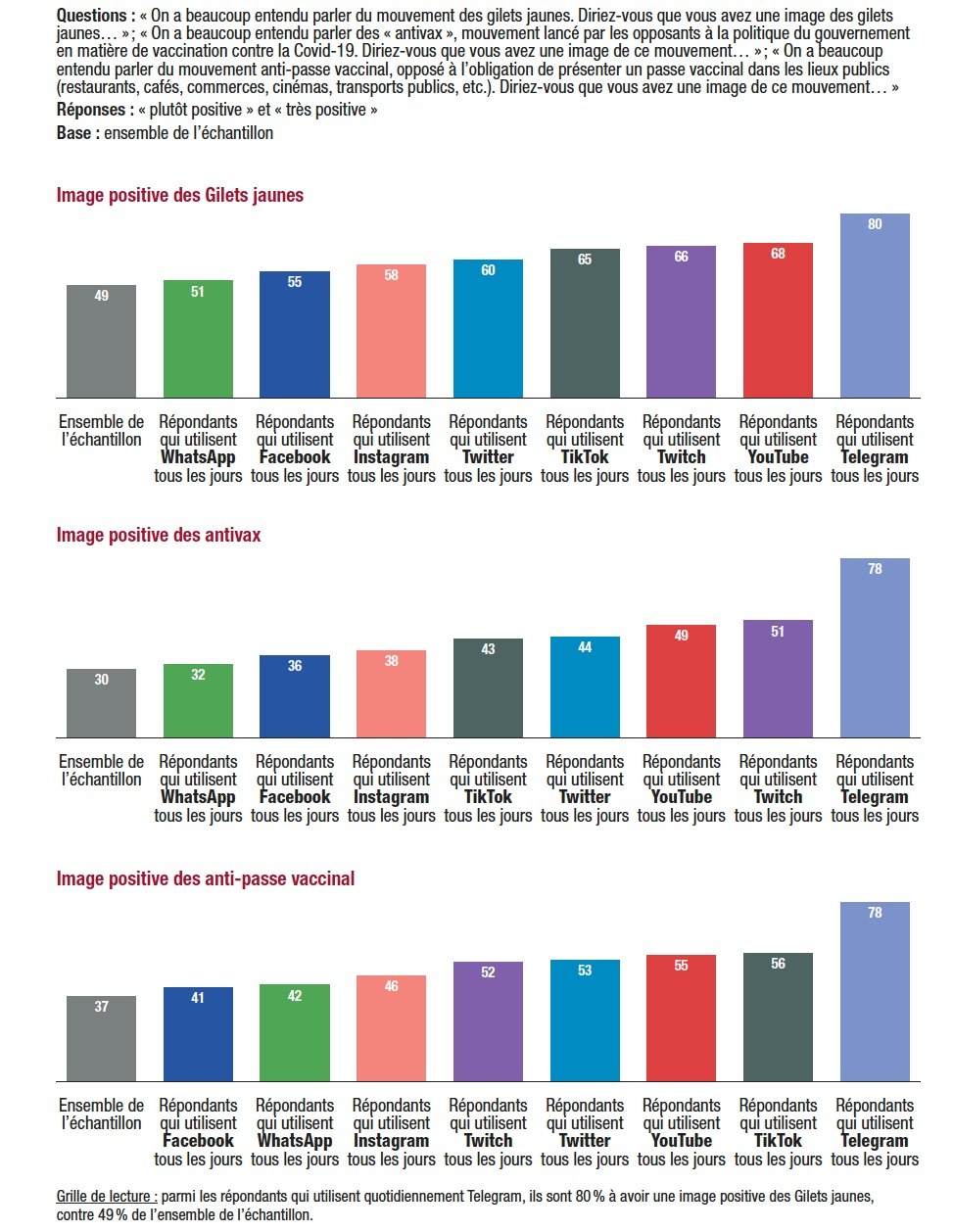 Les utilisateurs quotidiens de réseaux sociaux semblent plus sensibles à toutes les formes de mouvements antisystèmes. Les utilisateurs de Twitch et de Telegram, qui sont presque exclusivement des moins de 35 ans, sont les plus proches des mouvements protestataires. C’est d’ailleurs sur ces deux réseaux sociaux que nous retrouvons la plus grande proportion de répondants qui déclarent n’être pas vaccinés contre la Covid-19 et ne pas avoir l’intention de se faire vacciner (22% pour les utilisateurs quotidiens de Twitch et 24% pour ceux de Telegram, contre 11% en moyenne). Cependant, l’utilisation quotidienne de Facebook et de WhatsApp, qui sont les deux réseaux sociaux utilisés tant par les moins de 35 ans que par les 35-50 ans, semble avoir moins d’influence sur l’appréciation des mouvements