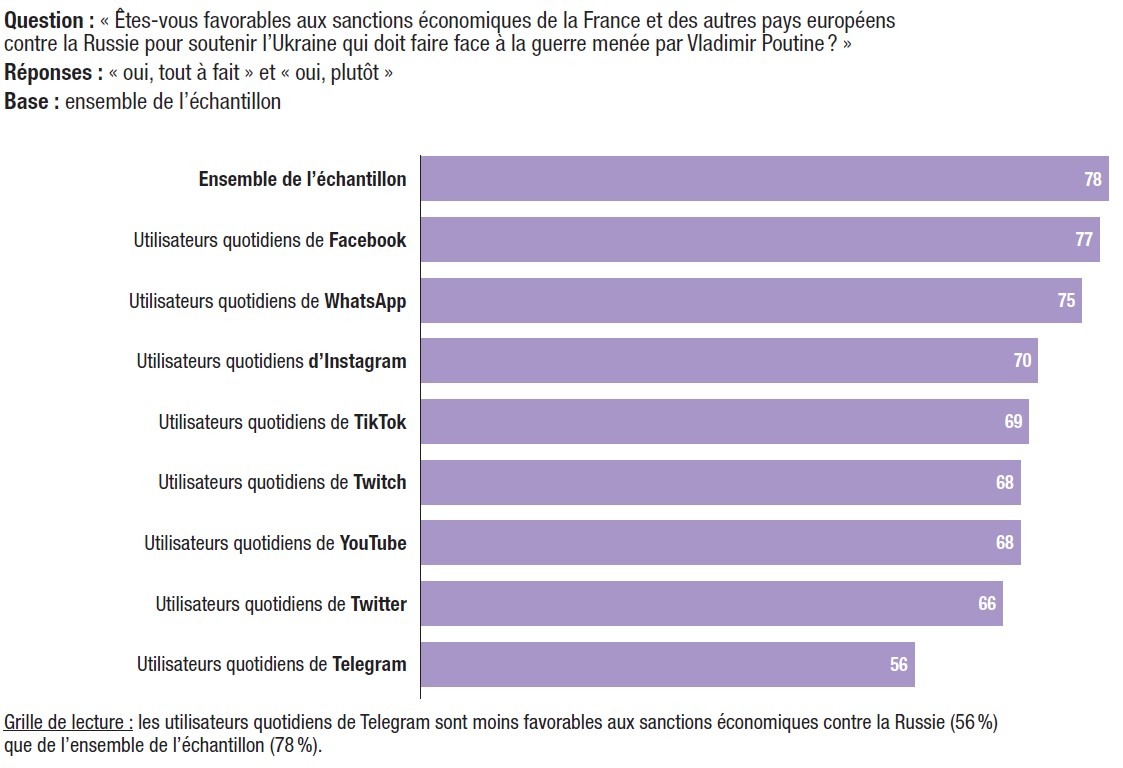 Les utilisateurs quotidiens des réseaux sociaux sont également plus susceptibles d’avoir une opinion positive du président russe Vladimir Poutine. Nous avons déjà montré que les mouvements protestataires sont mieux perçus par les utilisateurs quotidiens des réseaux sociaux que la moyenne des électeurs. Il en va de même s’agissant de la perception à l’égard de Vladimir Poutine. Ainsi, en moyenne, la proportion des électeurs qui ont une bonne opinion du président russe (10%) augmente significativement parmi ceux qui utilisent quotidiennement Instagram (15%), WhatsApp (17%), YouTube (20%), Twitter (24%), TikTok (24%), Twitch (32%) et Telegram (47%). Chez les utilisateurs quotidiens de Facebook, cette opinion positive de Poutine est de même niveau (11%) que la moyenne (10%).