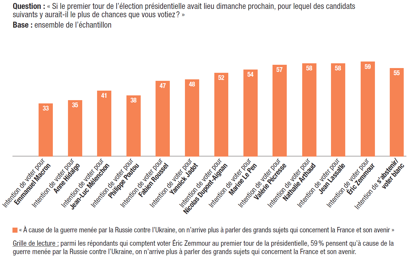 5. 48% estiment que l’on ne parvient plus à parler des grands sujets qui concernent la France et son avenir en raison de la guerre menée par la Russie contre l’Ukraine. Des variations significatives peuvent être relevées selon les électorats potentiels. Les électeurs potentiels d’Emmanuel Macron (65%) et de Jean-Luc Mélenchon (56%) affirment majoritairement que la crise en Ukraine n’empêche pas la discussion autour des thématiques qui intéressent l’avenir de la France, tandis que l’option inverse est plus souvent citée par les électeurs de Valérie Pécresse (57%), de Marine Le Pen (54%) et d’Éric Zemmour (59%), un point de vue également partagé par une majorité des électeurs (55%) prévoyant de s’abstenir ou de voter blanc lors du premier tour.