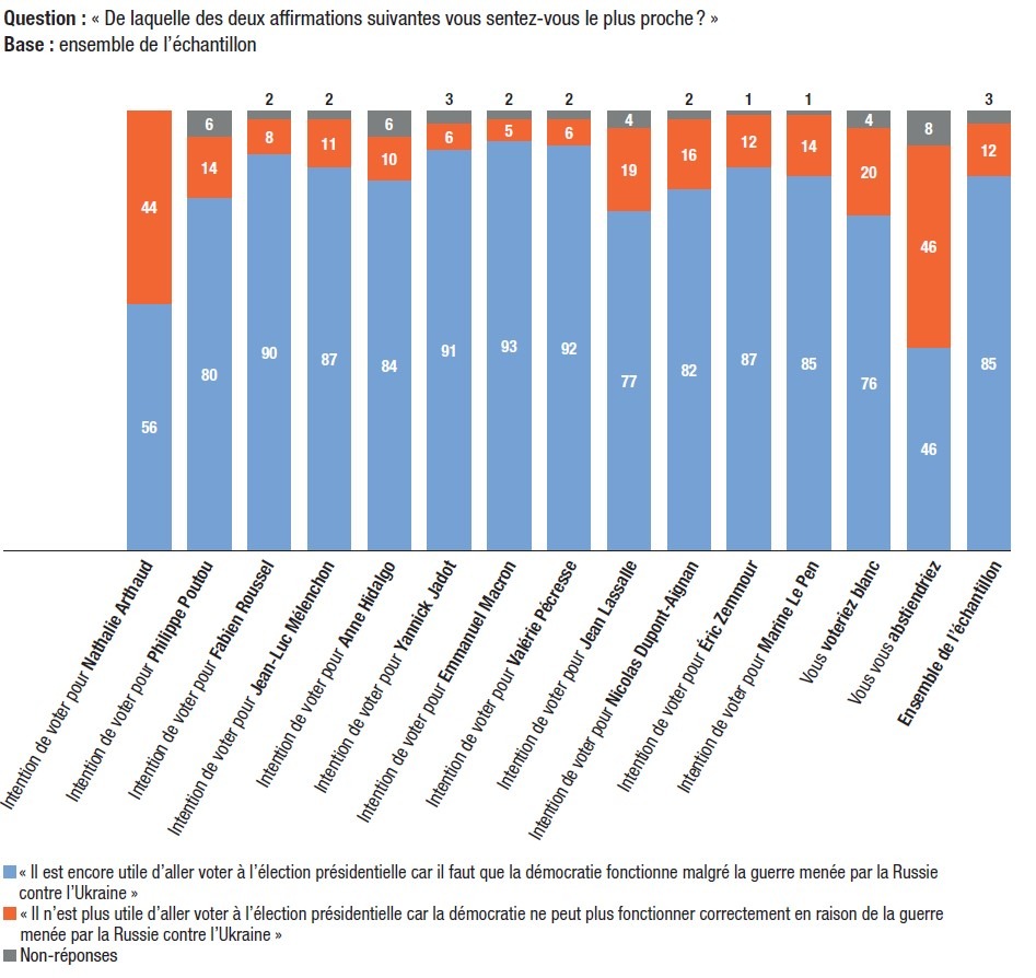 Comme le plus bel hommage rendu par notre démocratie au courage des Ukrainiens, les électeurs estiment massivement (85%) que, malgré la guerre menée par Poutine en Ukraine, il « est encore utile d’aller voter à l’élection présidentielle car il faut que la démocratie fonctionne malgré la guerre menée par la Russie contre l’Ukraine ». Un électeur sur dix (12%) considère au contraire qu’il « n’est plus utile d’aller voter à l’élection présidentielle car la démocratie ne peut plus fonctionner correctement en raison de la guerre menée par la Russie contre l’Ukraine » (3% de non-réponses).