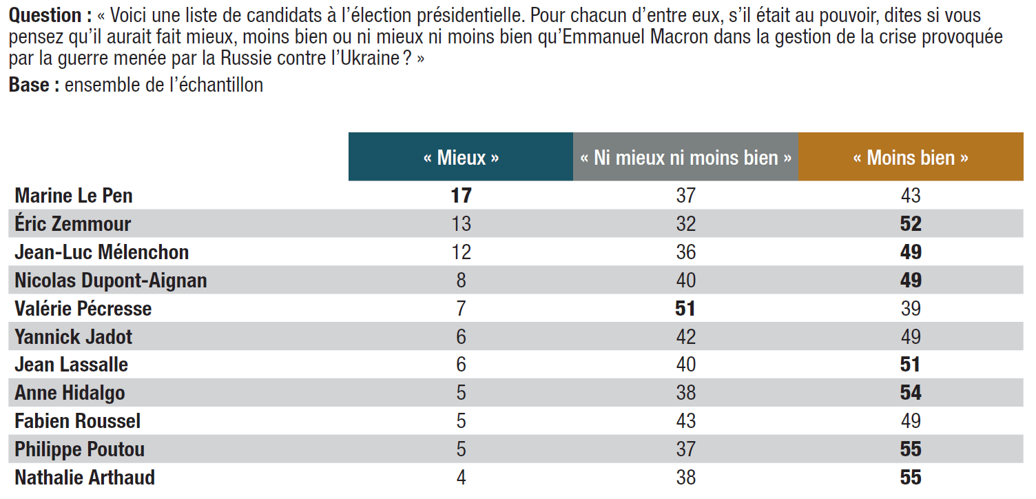 12. Aucun des concurrents d’Emmanuel Macron n’est jugé capable de pouvoir mieux gérer la crise ukrainienne que lui.