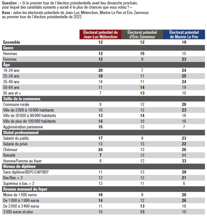 14. L’hétérogénéité des électeurs susceptibles de voter pour les trois principaux candidats protestataires est notable. L’électeur type de Jean-Luc Mélenchon est plutôt jeune, métropolitain, salarié du secteur public ou chômeur. L’électeur type de Marine Le Pen est d’abord une femme, âgée entre 18 et 24 ans, vivant dans une commune rurale, salariée du secteur privé autant que du secteur public, au chômage, femme au foyer, opposée à la mondialisation. Éric Zemmour recueille un niveau d’intentions de votes comparable dans les différents segments de la population, à ceci près que son électorat est sensiblement plus masculin.