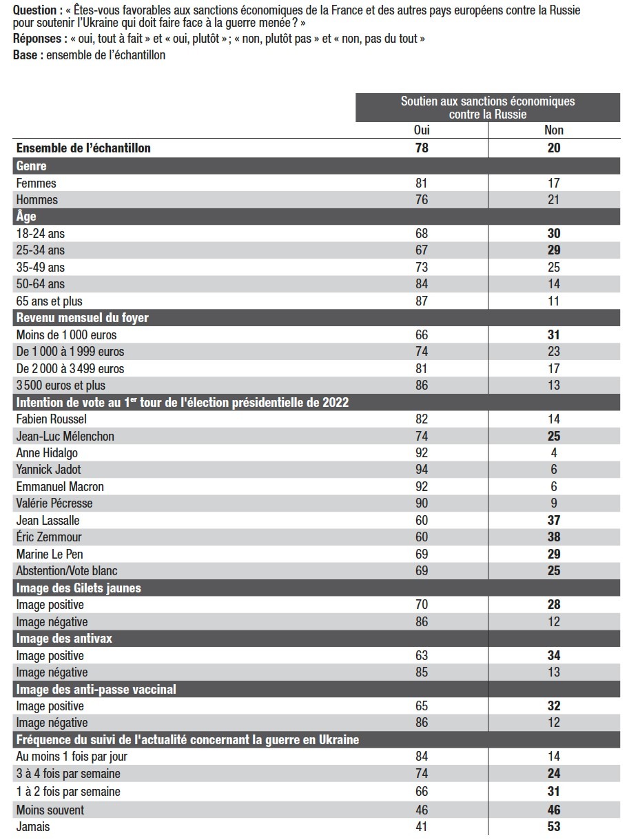 La plupart des répondants approuvent « le fait que les pays de l’Union européenne soient solidaires entre eux pour faire face à la crise déclenchée par la guerre de la Russie contre l’Ukraine » : 86% y voient « une bonne chose » (contre 12%, qui y voient plutôt « une mauvaise chose », et 2% de non-réponses). Par ailleurs, 78% des électeurs sont favorables « aux sanctions économiques de la France et des autres pays européens contre la Russie pour soutenir l’Ukraine ».