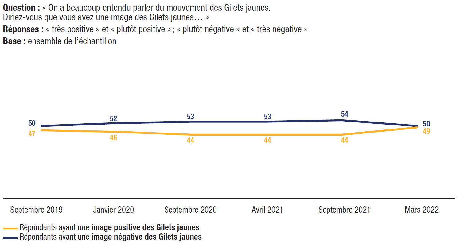 30. 49% des électeurs disent avoir une image positive des Gilets jaunes, un record depuis 2019. Par ailleurs, 30% des électeurs gardent une image positive des antivax, soit 3 points de plus qu’en septembre 2021 (27%), et 37% ont une image positive des anti-passe vaccinal.