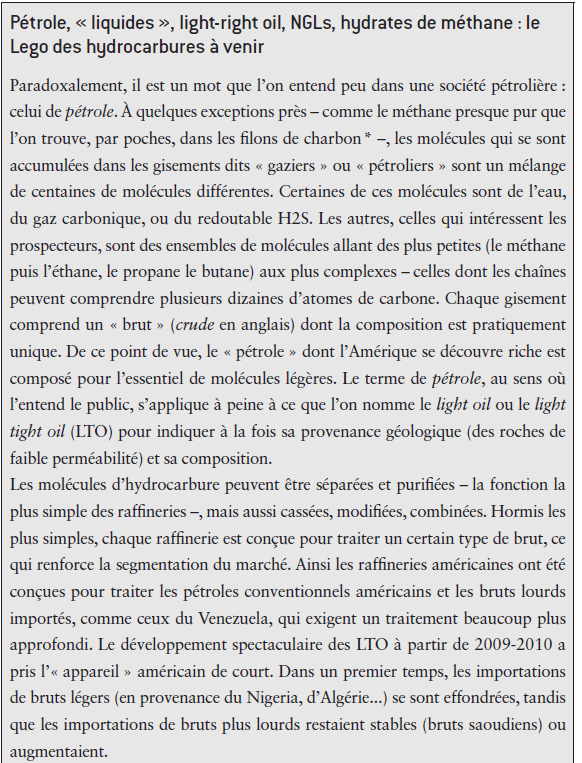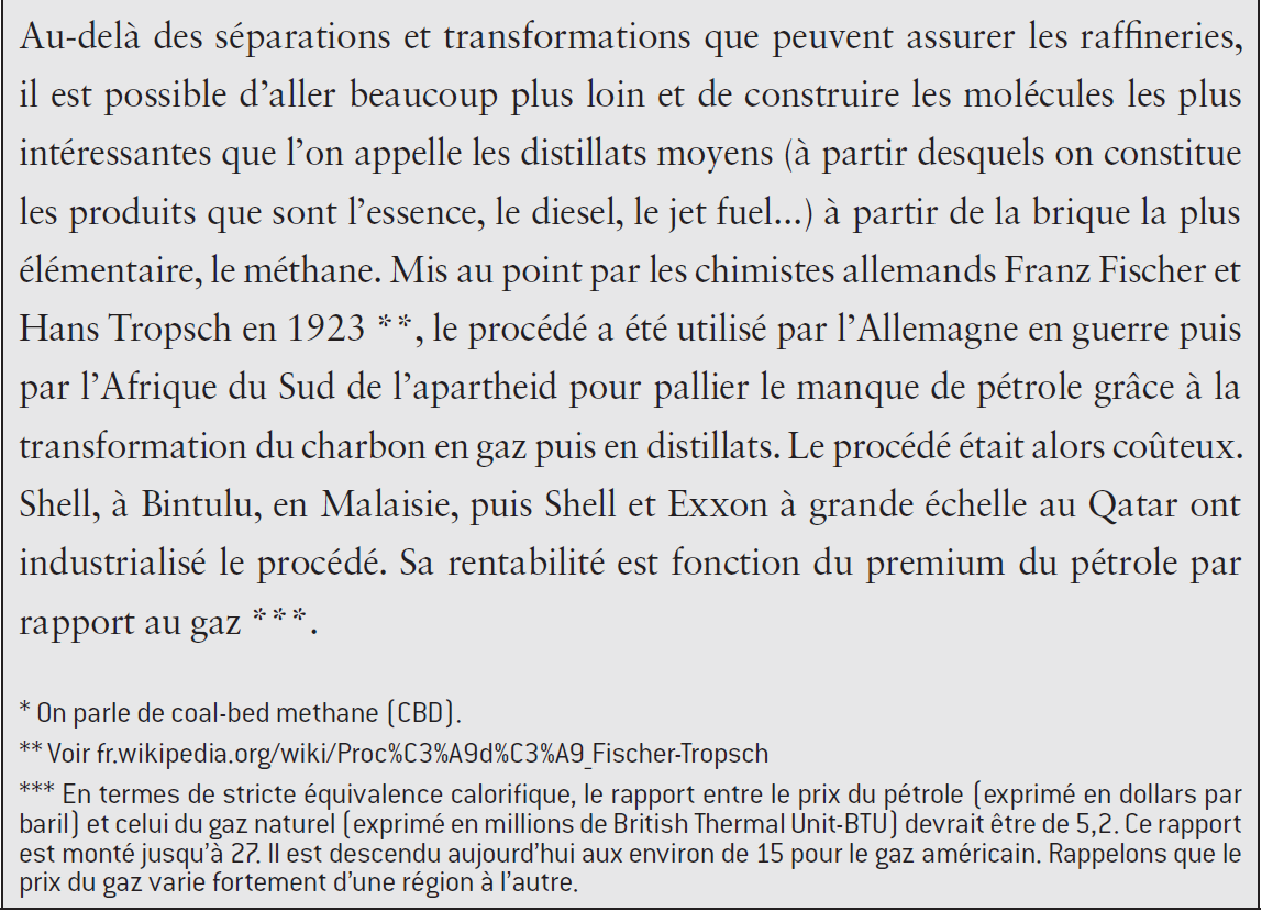 L’univers des hydrocarbures utilisables continuera à s’étendre. À l’horizon de trois décennies – celui des prévisions du «tout renouvelable» –, les hydrates de méthane, qui existent en quantités pratiquement inépuisables, pourraient devenir à leur tour une source de gaz et, par les procédés dits gas- to-liquid comme au Qatar, d’essence, de diesel, de jet fuel ou de naphta (voir encadré). Comme jadis, les hydrocarbures dits «de schiste», ces molécules de méthane enfermées dans de fragiles «cages» de molécules d’eau dans certaines conditions de température et pression semblaient inexploitables. Mais, en 2012, le programme japonais Jogmeg a réussi l’extraction d’hydrates de méthane de la fosse océanique Pacifique. Le méthane ayant un impact climatique vingt fois supérieur au gaz carbonique, on redoute bien sûr de déclencher – ou que le réchauffement climatique lui-même ne déclenche – une véritable «bombe climatique». Mais, à l’inverse, l’exploitation de tels hydrates pourrait se faire en remplaçant le méthane par une partie de l’excès de gaz carbonique que nous produirons, COP ou pas L’après-pétrole pourrait donc se révéler être vertement pétrolier : nos émotions et les critères moraux que nous substituons à l’analyse des faits sont parfois incomplets, voire trompeurs – qui se souvient des risques que l’on évoquait au XIXe siècle de voir les grandes métropoles paralysées par l’abondance du crottin de cheval que seules des voitures à cheval pouvaient évacuer ? Les définitions négatives de la transition – sortir du pétrole, sortir du nucléaire – substituent l’émotion au calcul et appauvrissent la gamme d’options stratégiques. Ayant leurs propres dynamiques, les acteurs réels inventent un futur officiel dont on peut presque prédire qu’il n’aura pas lieu, pas davantage que le désarmement universel.