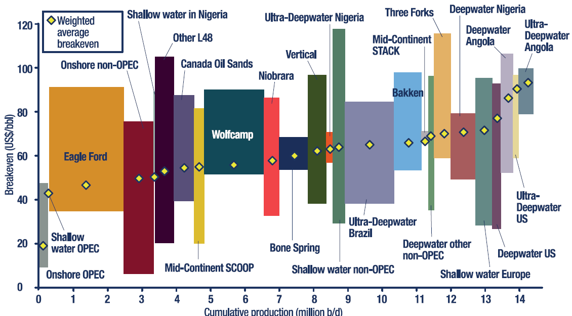 Wood Mackenzie, onshore breakevens at 10% discount rate, offshore at 15% discount rate, breakevens in US$ Brent equivalent