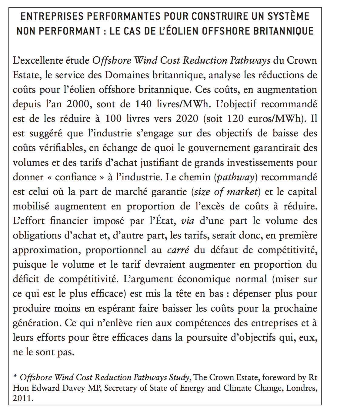 À l’évidence, l’unanimité qui entoure la « transition » possède des racines autres qu’économiques ou même politiques. De fait, l’examen critique auquel nous prenons le risque de nous livrer est délicat car, dans leur manière de se tromper, l’Europe et la France sont fidèles à ce qu’il y a de plus noble en elles, fidèles à l’impératif catégorique kantien selon lequel chacun doit se conduire de la manière dont il souhaiterait voir l’humanité entière se conduire. La transition énergétique s’inscrit dans un ensemble de valeurs sociétales que beaucoup érigent aussi en règles de vie personnelles : relation harmonieuse à la nature, mode de vie sobre, autonomie… Il faut pourtant distinguer l’intention individuelle du résultat systémique et, comme disent les Anglo-Saxons, « the feel good from the do good ». Tâche délicate car le feel good n’est pas égoïste mais vise à la survie de l’humanité sur une planète qui devient trop petite pour la somme des besoins qu’elle abrite. En résonance avec le discours sur la fin des temps et la destinée, des mots comme « ère », « transition » ou, en allemand, Energiewende (qui renvoie à Die Wende, le « tournant » de l’ex-RDA hors de la dictature communiste) visent la perfection (telle celle de la maison à zéro énergie) comme s’il s’agissait de règles de vie personnelles alors que l’allocation de ressources collectives doit permettre la poursuite simultanée d’objectifs d’éducation, de santé, de logement, de justice, de défense nationale dans une logique d’arbitrage et d’efficience. À l’automne 2013, la France va ainsi pour la seconde fois sélectionner les entreprises les plus efficaces dans l’utilisation à grande échelle d’une technologie pour longtemps encore inefficace, les éoliennes en mer. Bien que le gouvernement ait fixé un prix plafond, cette électricité pourra coûter jusqu’à trois fois (220 euros par MWh) ce que coûterait une électricité décarbonée efficace (70 euros environ, tous coûts inclus), et la facture annuelle pour les consommateurs sera d’un demi-milliard d’euros6 . Le rapport Syrota de 2007 présentait la réduction des émissions françaises de gaz à effet de serre (GES) d’un « facteur quatre » comme « vitale7 » : une telle pétition de principe était compréhensible deux ans avant Copenhague, mais, six ans plus tard, on gagnerait à surmonter ce que Rémy Prud’homme appelle le « contraste entre la nature de long terme des choix énergétiques et les réactions émotionnelles de très court terme […] qui semblent parfois déterminer les propositions ou les postures des uns et des autres8 ».