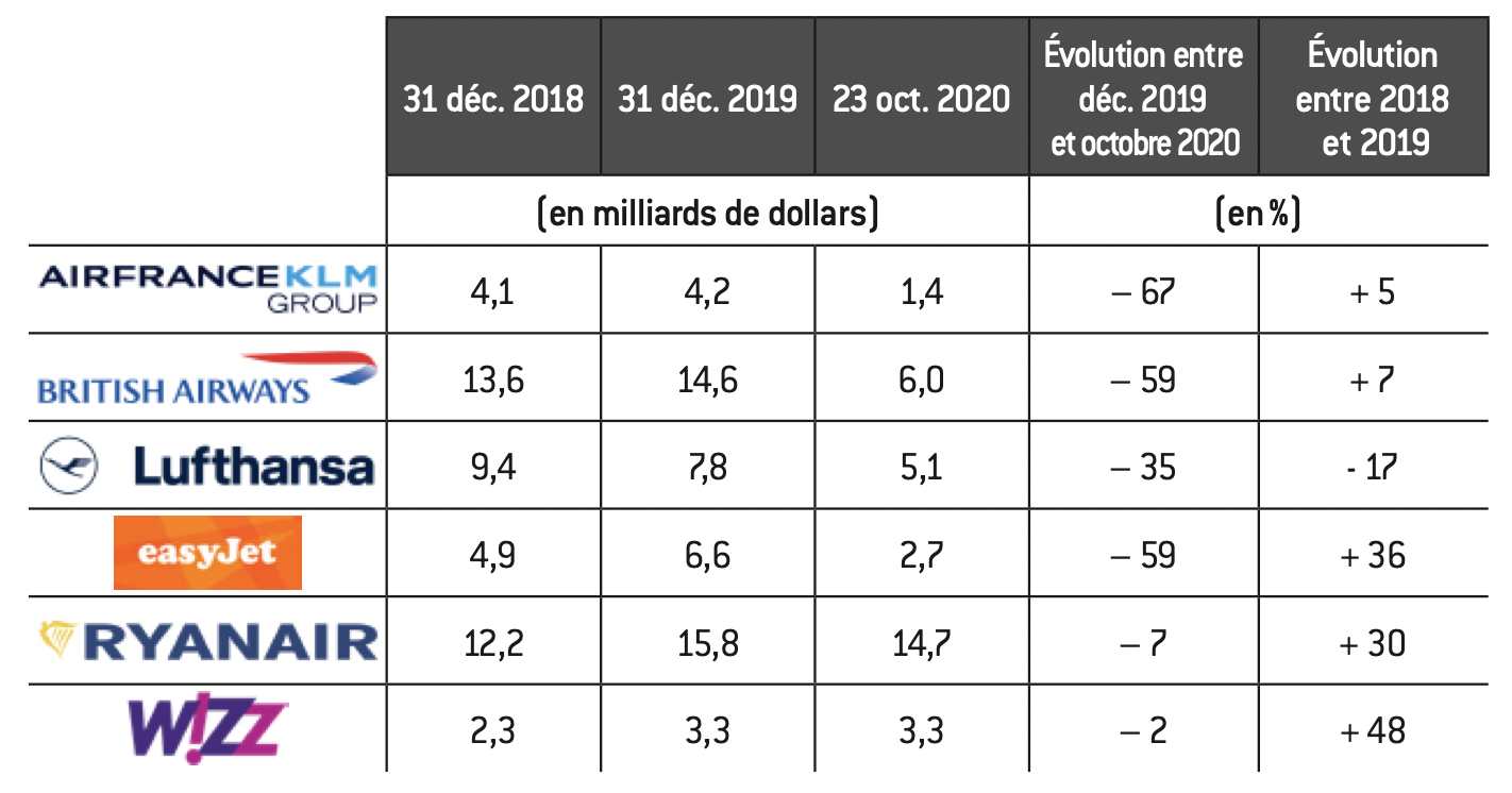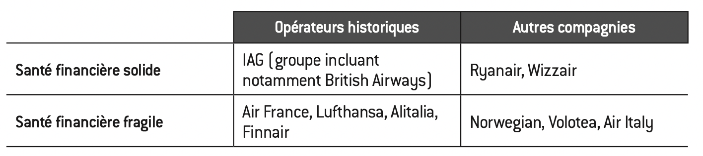 Pour autant, en termes de rentabilité et de capacité à résister à la crise, toutes les compagnies européennes ne sont pas logées à lamême enseigne : si plusieurs opérateurs historiques comme Air France-KLM ou Lufthansa survivront grâce à une aide publiquemassive, certains opérateurs low cost comme Ryanair ou Wizz Air vont pouvoir traverser la crise en puisant dans leurs réserves.