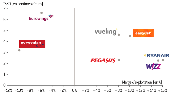Un premier modèle, que l’on retrouve également aux États-Unis avec Spirit Airlines, peut être qualifié d’ultra low cost. Il rassemble des compagnies comme Ryanair, Wizz Air ou Pegasus. Ces compagnies opèrent avec une base de coût unitaire (mesuré en CSKO) très faible, de l’ordre de 2,5 à 3 centimes, et qui ne dérive pas au cours du temps. Cette base de coût est plus de deux fois inférieure à celle d’un opérateur historique sur le moyen-courrier, dont le coût unitaire hors fuel est compris entre 6 et 8 centimes.