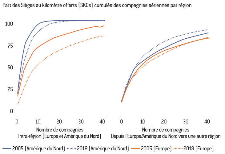 Outre la moindre concentration du marché parmi le top 5 de ses compagnies aériennes, l’Europe se caractérise par la présence d’un très grand nombre d’acteurs de petite taille. La queue de distribution des tailles est très longue une fois que l’on a passé les cinq premières entreprises. Cette plus faible concentration apparaît particulièrement marquée sur le moyen-courrier par rapport au long-courrier. Pour ce dernier segment, un mouvement de consolidation a déjà eu lieu, sous la forme d’accords bilatéraux, d’alliances, de joint-ventures, notamment sur les vols transatlantiques, tandis que l’obtention de droits de trafic limite la pénétration de nouveaux acteurs.
