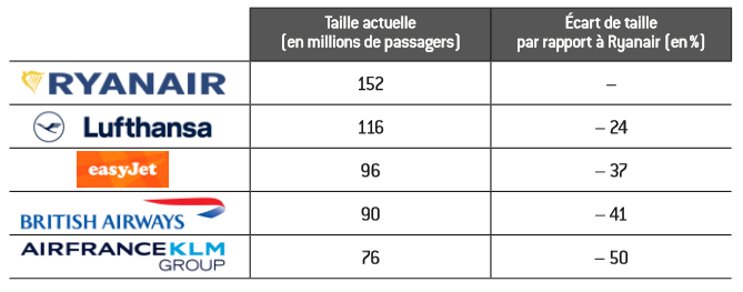 Si l’on raisonne sur le nombre de passagers transportés sur le moyen-courrier, il est frappant de constater que Ryanair était jusqu’en 2019 le premier transporteur européen, devant Lufthansa. L’écart de taille était encore plus prononcé avec les autres compagnies : à titre d’exemple, la taille de IAG sur le moyen-courrier représentait seulement 59% de celle de Ryanair.
