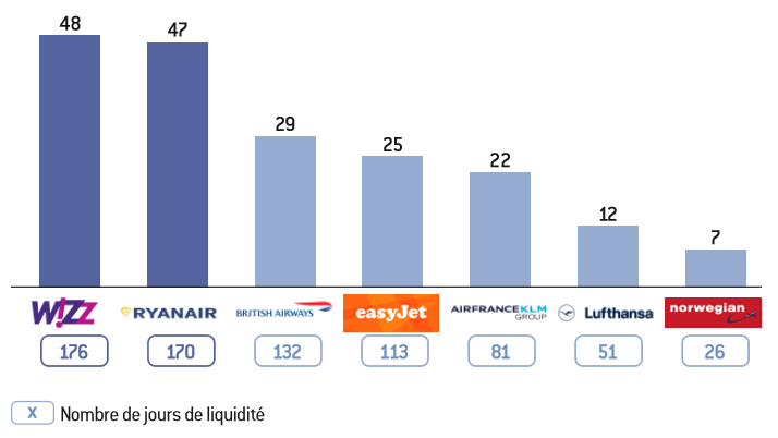 Au début de la crise du Covid-19, on constate que Ryanair disposait de liquidités représentant 47% de ses revenus annuels, soit l’équivalent de 170 jours de « résilience » ; ce chiffre était seulement de 81 jours pour Air France-KLM et de 51 jours pour Lufthansa. Avec une autre méthodologie, le Crédit suisse parvient à un résultat différent mais qui confirme toutefois la fragilité des opérateurs historiques : en l’absence de toute mesure, Lufthansa disposait au début de la crise de 25 jours de trésorerie et Air France-KLM de 69 jours.