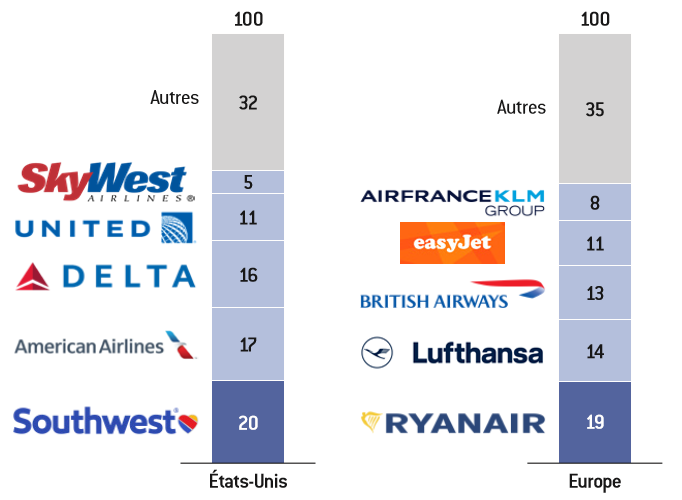 * Les parts de marché en Europe sont calculées sur les vols intra-Union européenne à l’aide des données de capacité des entreprises et en y appliquant les coefficients moyens de remplissage (load factor).