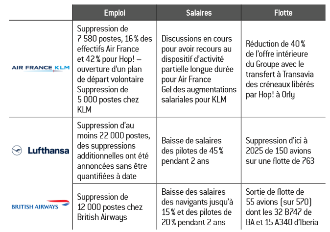 Principaux ajustements des compagnies historiques en termes d’emplois, de rémunérations et de flotte