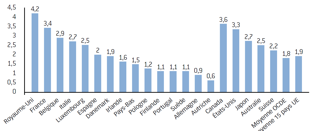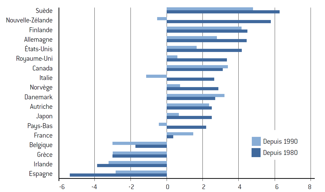 OCDE, d’après Bourguignon, op. cit. L’échelle des abscisses représente une variation du coefficient de Gini en points de pourcentage. Par exemple, si le coefficient de Gini pour la France était en 1990 de 0,5, la figure 1 suggère qu’il est passé depuis à 0,515.