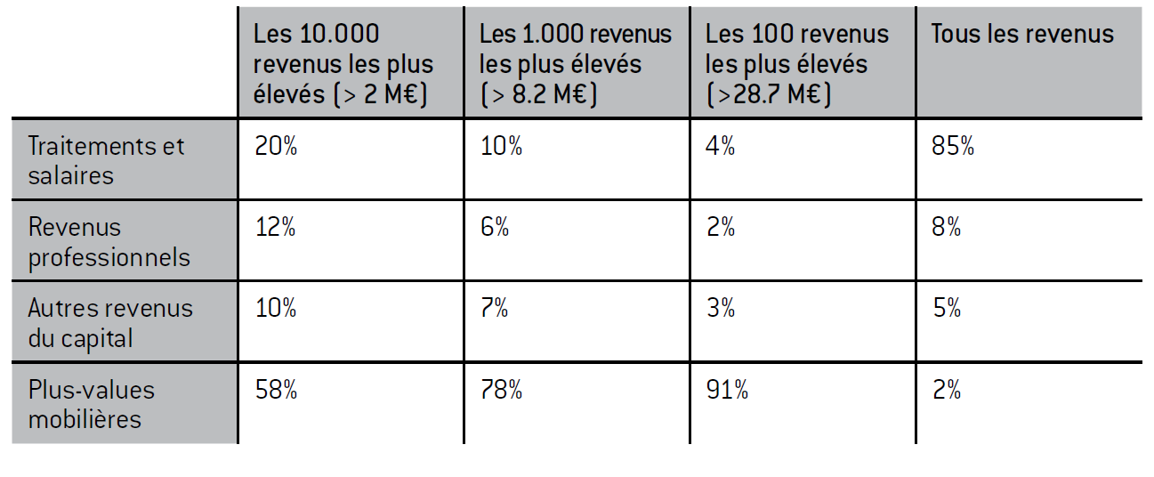 L’examen de la structure des revenus des foyers aisés (en chiffres de 2008) dans le tableau 1 permet de mettre en évidence que la part des salaires dans le revenu diminue avec l’augmentation de ce dernier.