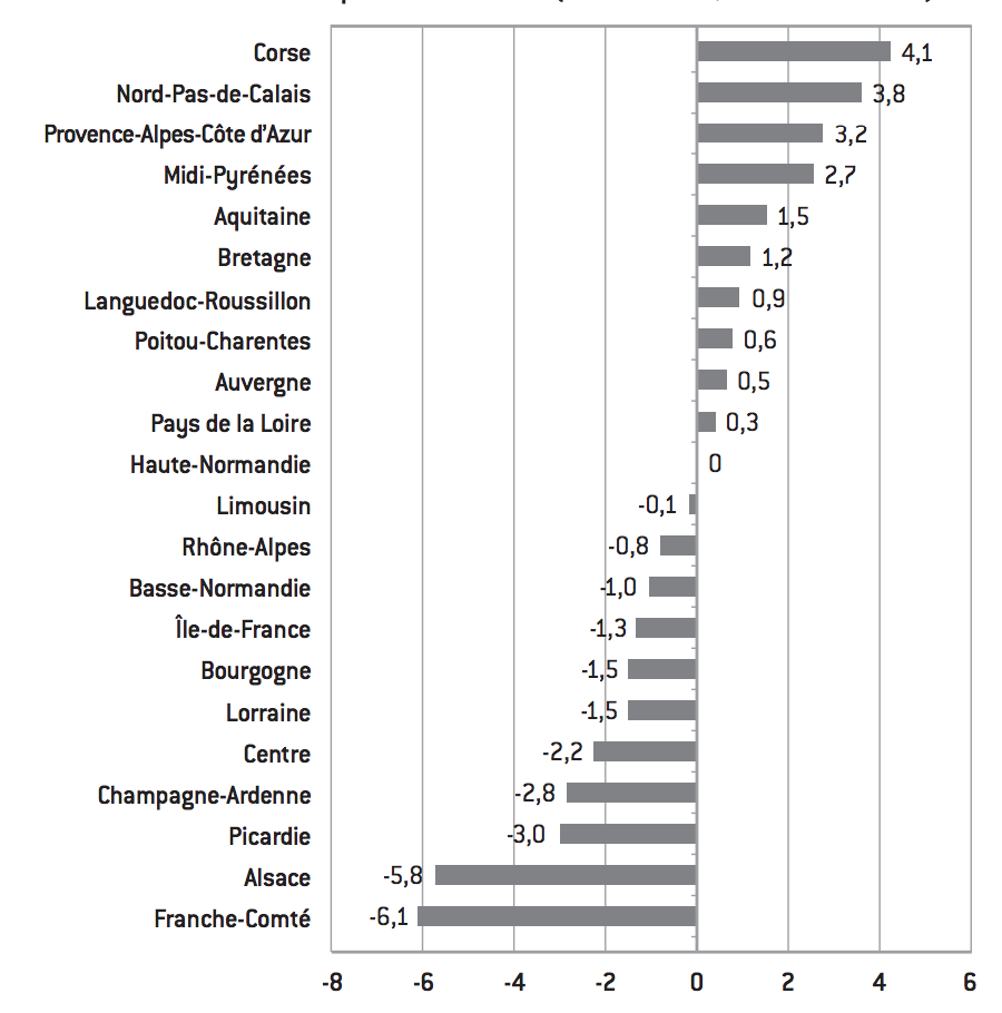 • les coûts de production dans les zones d’implantation. On comprend pourquoi les territoires qui sont à la fois de grande taille, dynamiques et à faibles coûts de production reçoivent des investissements très importants. Dans ce contexte, les grandes entreprises adoptent des modes d’organisation divers au niveau international et en changent en fonction des circonstances : sous-traitance, partenariat, joint-venture, intégration… L’activité a tendance à se concentrer dans les territoires les plus dynamiques, pour une raison liée à un phénomène d’économie d’échelle. Quand plusieurs grandes entreprises s’implantent dans un endroit, elles sont suivies par leurs partenaires et sous-traitants qui peuvent les livrer rapidement et permettre à leurs donneurs d’ordre de travailler en flux tendus. Se crée ainsi un écosystème qui attire main-d’œuvre et services de proximité (restaurants pour les salariés, centres commerciaux, crèches, nouveaux logements…). In fine se dégage un processus cumulatif qui rend les régions dynamiques encore plus attractives. C’est typiquement ce qu’on observe à Bangalore, à Shanghai ou, plus près de nous, dans la région de Bilbao. En France, on peut mesurer ce phénomène d’inégalités croissantes entre les régions tout simplement en observant l’écart-type des PIB régionaux par habitant. Depuis 2000, cet écart-type a augmenté de près de 25%. Ce creusement des inégalités régionales se traduit par de véritables transferts de PIB (par habitant) de certaines régions vers d’autres. Ainsi, plusieurs régions ont vu ces dernières années leur richesse relative reculer (Alsace, Île-de-France, Franche-Comté), alors que dans d’autres la richesse relative s’est accrue (Corse, Provence-Alpes-Côte d’Azur, MidiPyrénées…). De façon intéressante, l’Île-de-France est plutôt mal placée, ce qui rappelle si cela était nécessaire que les grandes régions, en matière de PIB ou de population, ne sont pas nécessairement les plus performantes. La «fusion» des régions ne saurait donc constituer un objectif en soi.
