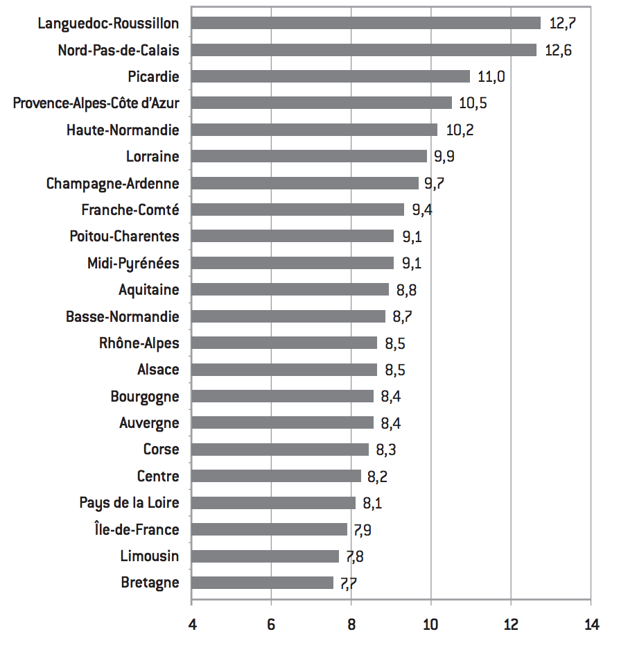 Le même constat peut être fait concernant le taux de chômage. Les marchés locaux du travail sont en effet très différenciés. Certains territoires ont un taux de chômage élevé en raison de flux migratoires importants et malgré des créations d’emplois dynamiques. C’est le cas du Languedoc Roussillon. D’autres ont un taux de chômage élevé en raison d’un faible dynamisme économique : la Picardie, par exemple. D’autres encore qui s’en sortent mieux, souffrent d’un désajustement entre offre et demande de travail (la Bretagne). Il est clair que ces différences territoriales appellent des politiques locales de l’emploi. Certes, si les inégalités en matière de PIB par habitant (et, dans une moindre mesure, d’emploi) ont eu tendance à s’accroître ces dernières années, cela a beaucoup moins été le cas en matière de revenu disponible des ménages (c’est-à-dire la somme des salaires, des profits des entrepreneurs individuels et des revenus sociaux, retranchée des cotisations sociales et des impôts directs). La dispersion nationale en matière de revenus par habitant est quatre fois moins forte que la dispersion des PIB par habitant.