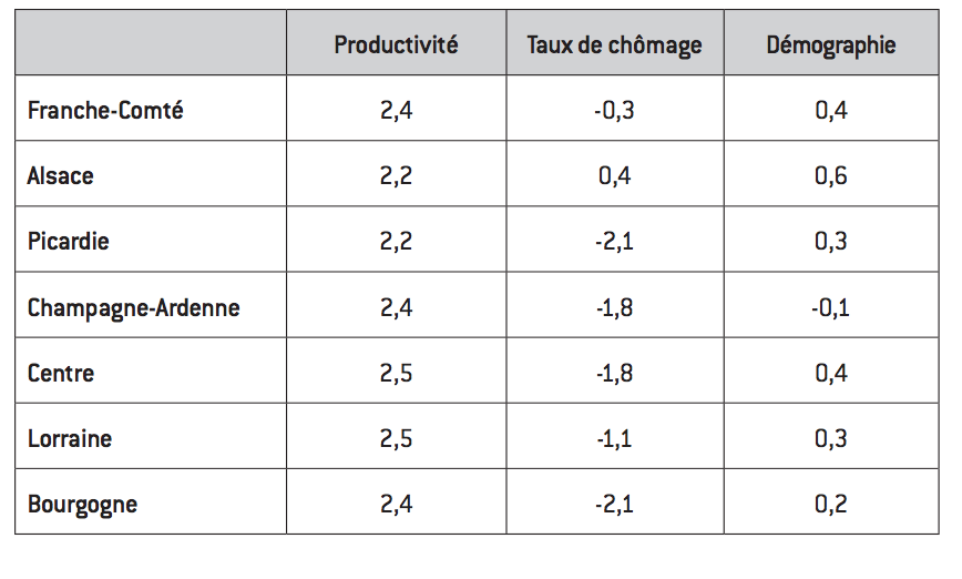 Ainsi, parmi les régions connaissant des difficultés, on trouve tous les cas de figure. L’Alsace souffre de gains de productivité limités et d’un taux de chômage en augmentation tendancielle, alors que sa démographie est favorable. La région a donc besoin d’une politique de l’innovation couplée à une politique de formation. La région Champagne-Ardenne, elle, souffre de gains de productivité modérés et d’une baisse de sa population. Il faut donc y coupler une politique en faveur de l’innovation et une politique d’attractivité à destination des jeunes ménages qualifiés. Quant à la Franche-Comté, elle a davantage besoin de mettre l’accent sur la formation… Par définition, une politique nationale aura beaucoup de mal à appréhender ces différences.