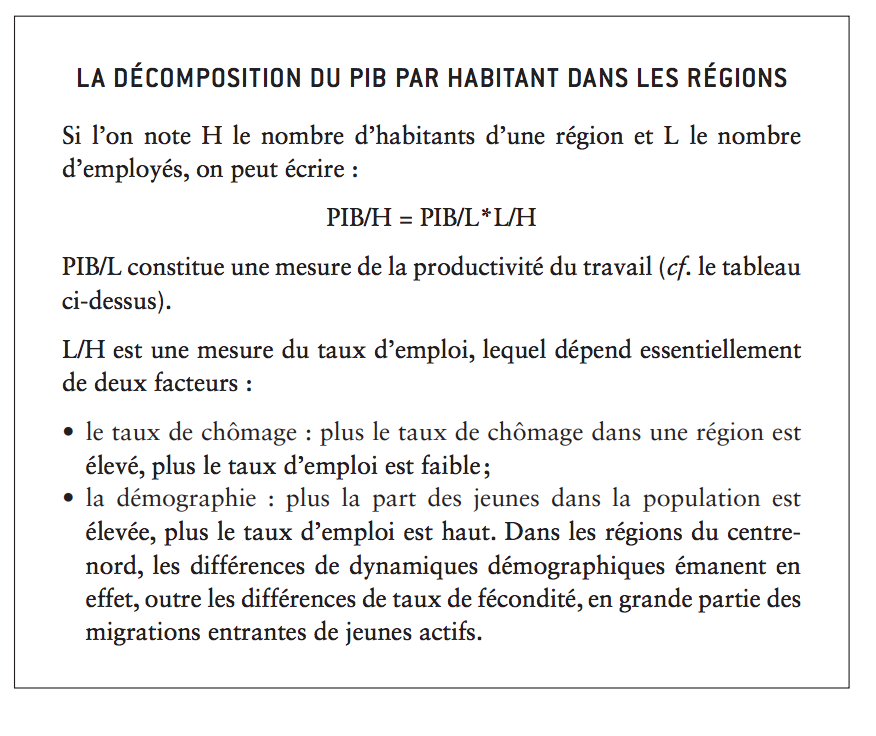 • un mode de spécification. Il s’agit de regrouper des entreprises qui disposent de compétences spécifiques similaires (utilisation de travail qualifié, forte intensité en capital, besoins de financement à long terme élevés…), mais pas forcément dans les mêmes secteurs. L’idée centrale est qu’en cas de suppression d’emploi dans une entreprise les salariés licenciés puissent se redéployer facilement dans d’autres sociétés. La logique de spécification est la plus efficace du point de vue économique. Elle suppose néanmoins une action des collectivités locales pour éviter de constituer un simple mode d’agglomération. Elle passe également par la mise au point d’un système de formation professionnel local. Prenons un cas extrême : celui de la Franche-Comté. Depuis 2000, le PIB par habitant y a progressé en moyenne chaque année d’un peu moins de 0,5% en volume, soit un rythme inférieur de moitié à celui de la France. Ce qui signifie que la création de richesses réelles par habitant est, dans cette région, au point mort. L’État central lisse les revenus Francs-Comtois par sa politique fiscale et sociale, mais il n’agit pas sur les raisons de l’absence de développement économique de cette région, qui sont essentiellement d’ordre microéconomique : une structure sectorielle encore très industrielle, dominée par l’automobile et le travail des métaux, la production horlogère, les lunettes, les jouets, pour une grande partie dans un cadre de sous-traitance. Un travail utile, pour cette région, consisterait à identifier précisément les secteurs surreprésentés localement, en admettant que cette surreprésentation correspond certainement à une richesse locale en ressources bien spécifiques (ouvriers métallurgistes spécialisés, par exemple), et en définissant des pistes d’actions publiques (dans le domaine de la formation notamment) qui permettent aux entreprises régionales de se redéployer sur des segments non encore concurrencés. Il s’agit finalement de s’interroger moins sur ce qui pourrait faire fuir les entreprises (les amener à «délocaliser» des activités), que sur ce qui pourrait les retenir. Ce travail, réalisé au plus près du terrain, ne peut bien évidemment pas être conduit par un État central, surtout dans un pays aussi grand que la France (la situation est sans doute différente, par exemple, au Luxembourg). De plus, il demande des ressources budgétaires locales suffisantes, ce qui n’est pas toujours le cas à l’heure actuelle. En outre, même pour des régions dont le PIB par habitant progresse peu, les sources des difficultés économiques peuvent être très différentes. Une décomposition arithmétique rapide montre que l’évolution du PIB par habitant dépend de trois facteurs, et trouve donc sa résolution dans des priorités politiques différentes :