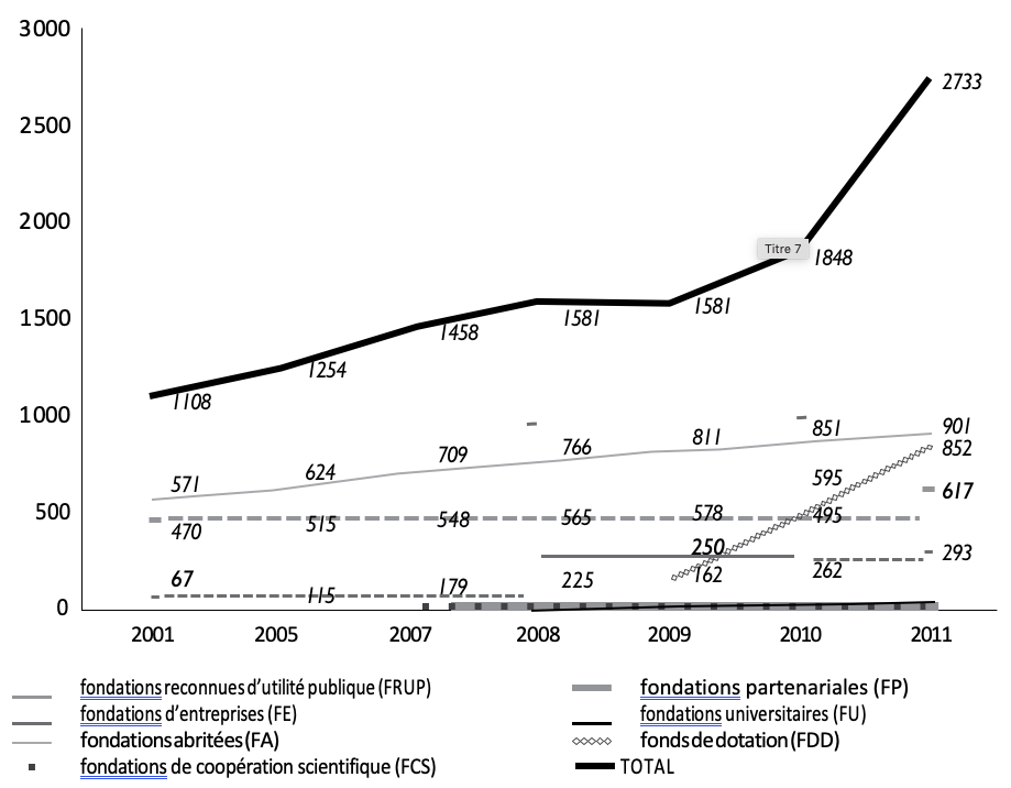 Graphique 1 : Évolution du nombre de fonds et fondations en France entre 2001 et 2011 (hors Fondations abritées à l’Institut de France)