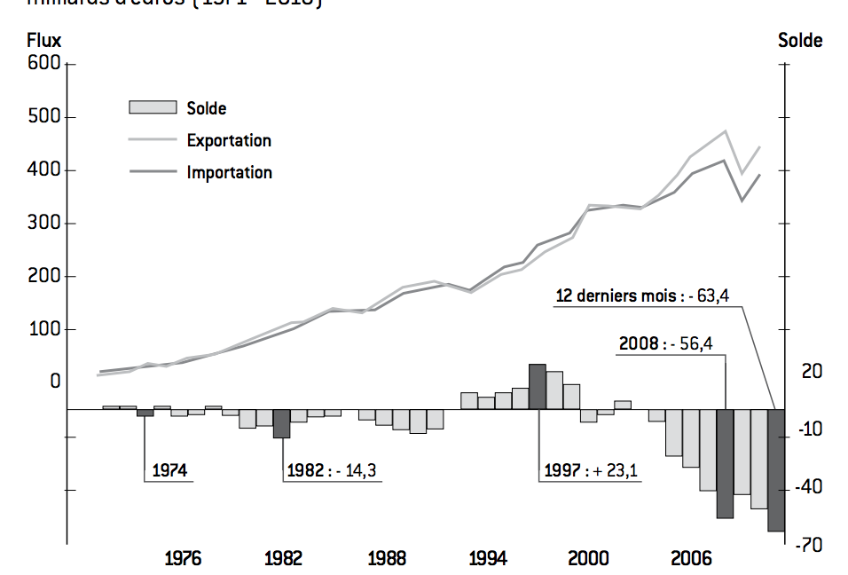 Si l’on raisonne sur 40 ans, force est de constater que jamais la France n’a connu une détérioration à la fois si marquée et si continue de son commerce extérieur (graphique 1).