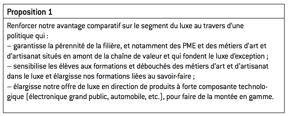 Si l’on veut que le luxe reste un avantage de spécialisation majeur pour la France, il est nécessaire de mener une politique de pérennisation de nos savoir-faire et de nos métiers d’art, situés souvent en amont de la chaîne de valeur, au sein de PME qui travaillent pour les grands groupes de luxe. Faute de quoi, certaines compétences pourraient disparaître assez vite, comme cela est arrivé dans le domaine de la chaussure haut de gamme implantée jadis à Romans. Plus encore, pour renforcer notre avance dans le luxe, il est aujourd’hui nécessaire de ne pas « s’endormir sur nos lauriers » et de favoriser l’éclosion de nouveaux segments du luxe, en allant au-delà des territoires connus que sont la maroquinerie, l’horlogerie-joaillerie, le parfum ou e prêt-à-porter. Il faut en réalité sortir d’une approche purement sectorielle pour aller vers une démarche plus transversale, qui puisse irriguer l’ensemble des secteurs industriels. On peut en effet trouver un segment de luxe dans presque toutes les activités productives : songeons à l’automobile avec des marques comme Ferrari, à l’univers du téléviseur avec Bang & Olufsen, aux yachts de luxe avec les firmes italiennes Ferretti ou Riva, etc. Il y la place aujourd’hui pour un développement en France de nouveaux segments de luxe, au travers d’un rapprochement avec les industries plus « traditionnelles », qui seraient ainsi tirées vers des segments à plus forte valeur ajoutée.