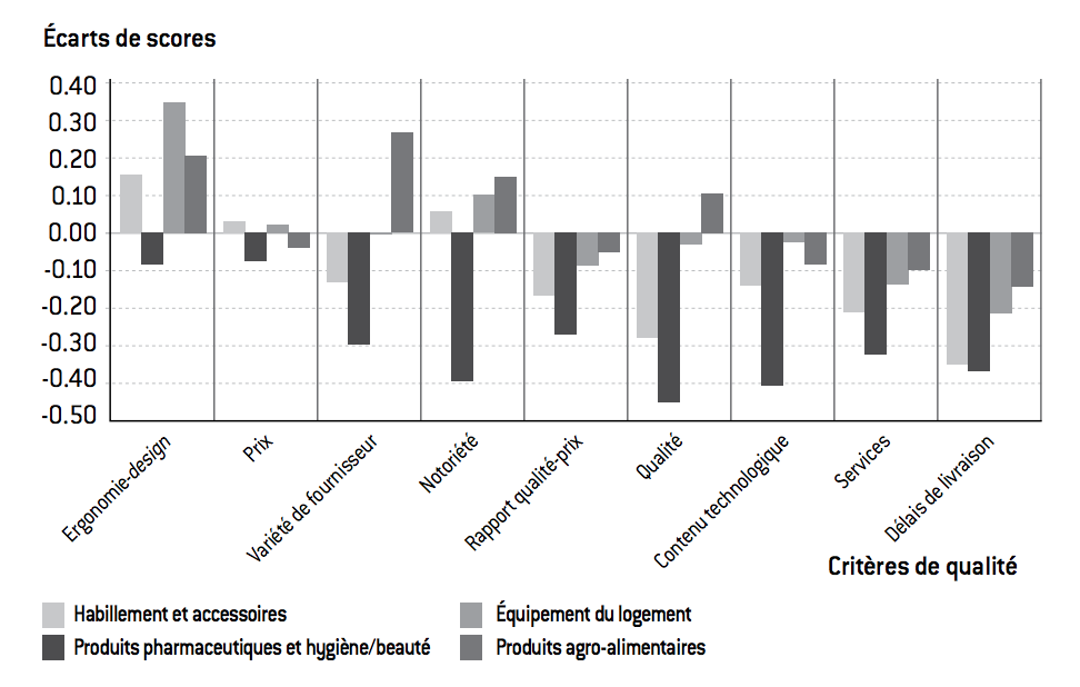 Graphique 2 : Écarts de scores, entre la France et l’Allemagne, sur des critères de qualité pour des biens de consommation (moyenne des écarts de scores entre 1992 et 2010)