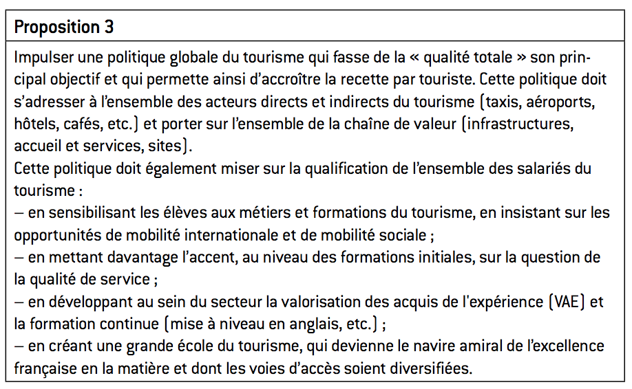 Sur ces différents aspects de la qualité, les nombreuses enquêtes et rapports font ressortir une situation assez contrastée : si la France apparaît très bien positionnée sur la qualité et la variété des sites à visiter, les touristes se révèlent assez critiques quant à la qualité des infrastructures, en particulier au niveau des aéroports, tandis que l’accueil et le service, à l’exception du segment du luxe, sont perçus comme perfectibles. Plusieurs initiatives récentes vont dans le bon sens – réforme du classement des hôtels en 2009, mise en place du label « Qualité tourisme », etc. – mais ces politiques restent focalisées sur des éléments isolés de la chaîne de valeur, alors même que la qualité doit se penser de manière transversale et irriguer l’ensemble de l’offre touristique, de l’arrivée au départ du touriste. Prenons l’exemple de Paris : l’effort sur la qualité d’accueil ne saurait se cantonner à l’hôtellerie et doit inclure des sujets aussi différents que les files d’attente lors des contrôles d’identité à l’aéroport, la disponibilité et le prix des taxis, l’ouverture des magasins le dimanche dans les quartiers touristiques, l’accueil et la signalisation dans les gares et aéroports, la propreté des rues, la maîtrise minimale de l’anglais par tous les acteurs du tourisme, etc. L’adoption d’une démarche de qualité ne se fera pas sans une remise à plat de la formation aux métiers du tourisme. Là encore, force est de constater que, pendant longtemps, le secteur a peu investi dans la qualification de son personnel, et tout particulièrement le segment des HCR (hôtels, cafés et restaurants). En effet, sur ce segment, le caractère saisonnier de nombreux emplois, le fort taux de rotation de la maind’œuvre, la faible taille des entreprises n’incitaient guère à investir en capital humain. L’enjeu est que chaque salarié du tourisme possède une qualification qui soit en phase avec les attentes des clients (maîtrise de l’anglais pour les taxis, par exemple).