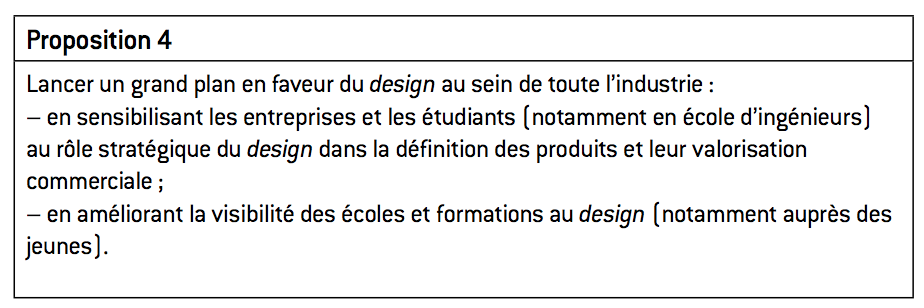 La compétitivité-qualité repose également sur la capacité de nos entreprises à concevoir des produits et services nouveaux, différents de ceux proposés par les concurrents étrangers et qui suscitent l’adhésion des consommateurs. L’exemple d’Apple est à cet égard révélateur : la firme américaine, grâce à la R&D mais aussi et surtout grâce au design, à la combinaison intelligente de fonctions différentes (« innovation d’usage ») et au marketing, a réussi à « réinventer » des produits tels que le téléphone portable ou le baladeur, dont on pouvait penser qu’ils étaient devenus des produits « banalisés ». En réalité, la créativité permet de repousser éternellement les limites du marché, de renouveler continuellement les besoins : tous les produits sont susceptibles d’être repensés, relookés, pour susciter chez le consommateur le désir d’achat et de renouvellement. Il n’y a pas à vrai dire de secteurs dépassés, mais simplement des produits et des technologies obsolètes. Pour s’en convaincre, il suffit de regarder ce qui s’est passé sur le marché de la lunette de vue et solaire, en l’espace de 20 ans. Les Italiens y ont lancé la révolution du design et représentent aujourd’hui 96% de la production européenne. Les créateurs italiens rivalisent d’ingéniosité pour proposer une large palette de formes, de couleurs, de motifs et renouveler en permanence les collections. En misant sur la créativité, les Italiens se sont résolument positionnés sur le haut de gamme, laissant à la Chine les lunettes à bas prix. Pour miser sur la créativité dans tous les secteurs de notre économie, encore faut-il que nous sortions d’une vision étroite de l’innovation, trop souvent centrée sur la R&D et sur la figure de l’ingénieur. L’innovation ne se résume plus seulement aux produits technologiquement complexes, aux grands projets riches en ingénierie comme les moteurs d’avion, les trains à grande vitesse, les turbines ou les centrales nucléaires : l’innovation peut être partout. L’innovation inclut également les nouvelles méthodes commerciales (low cost, commerce électronique, etc.), les marques, les modèles et dessins ou le design5. L’exemple du design Pour une majorité de biens durables (automobiles, matériel hi-fi, etc.), le design constitue aujourd’hui un critère décisif dans le choix des consommateurs, à la fois en termes de fonctionnalité et d’esthétique des produits. D’ailleurs en anglais to design signifie « concevoir », ce qui illustre l’importance de ce concept. Les Italiens l’ont bien compris et ont réussi à imposer leur griffe sur nombre de produits, parfois d’usage ordinaire comme les ustensiles ménagers mais également dans l’automobile. De même, les Anglais ont pris conscience de l’importance du design et ont lancé des initiatives pour mieux le diffuser au sein de l’industrie et des PME. La France accuse en la matière un certain retard, considérant trop souvent qu’un « bon » produit se résume à sa dimension technologique et que le design relève d’abord de l’esthétique : selon l’APCI, plus de 60% des entreprises françaises ne recourent pas au design contre 35% des entreprises britanniques et 25% des entreprises suédoises. Nous devons changer de posture et considérer le design comme un levier d’innovation à part entière, en sensibilisant l’ensemble de nos industries à la nécessité d’intégrer cette dimension dans la conception des produits.