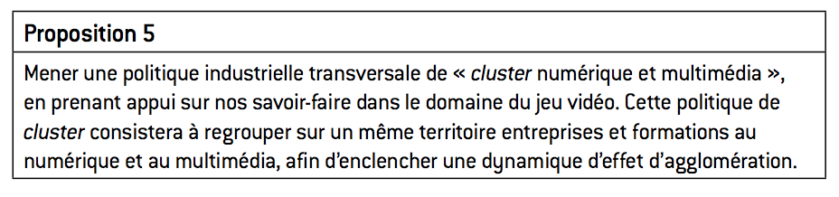 Autre exemple d’une industrie innovante et créative, bien qu’elle ne repose pas sur de la recherche-développement : l’industrie du jeu vidéo. Une industrie qui représente aujourd’hui un marché de 50 milliards d’euros (en y incluant le mobile et le on-line) et connaît de fortes perspectives de croissance, grâce au renouvellement permanent des produits, au développement de nouveaux segments de marché (serious games par exemple), à l’apparition de nouveaux modèles économiques (cloud gaming, jeux sur téléphone portable) et de nouvelles technologies (l’image 3D, par exemple). À vrai dire, le jeu vidéo constitue aujourd’hui une clé d’entrée dans le monde de l’économie numérique et ses compétences sont suffisamment transversales pour irriguer de nombreux secteurs. La France occupe sur ce marché une place assez paradoxale. D’un côté, notre pays a été l’un des pionniers dans le développement de jeux vidéo dès les années 1980, et nos créateurs ainsi que nos formations restent reconnus internationalement. Plus encore, deux des trois leaders mondiaux de l’édition sont des entreprises dont le siège social est en France, tandis que le français Gameloft occupe la première place sur le segment des jeux vidéo téléchargeables et sur réseaux sociaux. Et pourtant, en dépit de ces forts avantages compétitifs, la France n’a jamais réussi à capitaliser son expérience et à impulser sur son territoire une véritable dynamique industrielle, malgré la présence d’une multitude de PME très créatives. En fait, le jeu vidéo n’a jamais été considéré dans l’Hexagone comme un véritable secteur stratégique. Il en résulte que l’essentiel de la valeur ajoutée et des emplois créés par les leaders français du jeu vidéo n’est pas réalisé sur le territoire français mais à l’étranger, et notamment au Québec. En effet, la province du Québec a réussi à attirer de nombreux éditeurs étrangers, au travers d’une politique industrielle volontariste fondée sur de fortes incitations fiscales – pas moins de 80 millions de crédit d’impôt en 2010 – mais dont le retour sur investissement est largement assuré, au regard de la valeur ajoutée créée par cette industrie. Plus encore, afin d’assurer la pérennité de l’implantation des studios, la province du Québec a réussi à créer un véritable cluster rassemblant entreprises et formations universitaires dans le domaine du multimédia, ce qui permet aux éditeurs de disposer d’un vivier local de main-d’œuvre qualifiée