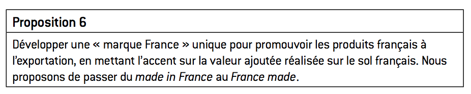En deuxième lieu, l’attribution de la « marque France », sa promotion et sa défense doivent être confiées à un organisme unique, alors que l’on assiste plutôt aujourd’hui à une concurrence entre acteurs publics, sans véritable coordination entre eux. En troisième lieu, le choix de la dénomination et du logo doit faire l’objet d’une véritable approche marketing, tournée d’abord vers les attentes des clients étrangers. Il est en effet symptomatique de constater que la question du made in France est trop souvent abordée sous l’angle de sa réceptivité par les consommateurs français, alors qu’elle vise d’abord à partir à la conquête des marchés extérieurs. Cette marque doit donc être compréhensible par une majorité de personnes, ce qui implique sans doute de la mettre en anglais plutôt qu’en français. En dernier lieu, il nous semble important de sortir d’une approche fondée sur le made in, pour aller vers une approche en termes de valeur ajoutée. En effet, dans un monde dominé par le poids de la marque, de la créativité et de l’innovation, le plus important n’est pas le lieu dans lequel a été assemblé le produit, mais le lieu dans lequel l’essentiel de sa valeur ajoutée a été créé.
