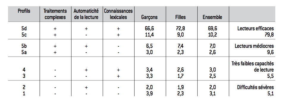 Si la mesure de l’illettrisme n’est pas chose aisée, plusieurs indicateurs statistiques laissent à penser que son niveau reste encore élevé dans notre pays. Les derniers résultats de l’enquête PISA 2011 indiquent ainsi qu’en France, 19,8% des jeunes de quinze ans présentent de réelles difficultés de lecture. À l’autre bout du spectre, l’Insee dans ses enquêtes de vie quotidienne estime que 3,5 millions de personnes adultes sont en situation d’illettrisme. Des efforts importants ont été menés ces dernières années dans la lutte contre l’illettrisme au niveau de l’école maternelle et primaire, mais il n’en demeure pas moins que notre pays doit également affronter un « effet stock », correspondant aux adultes actuellement en situation d’illettrisme. Une politique à destination des salariés se met en place depuis peu mais il reste aujourd’hui à compléter ce dispositif, en ciblant également les jeunes de 17 à 18 ans, dont on peut observer le niveau de lecture lors de la Journée défense et citoyenneté (ancienne JAPD). En effet, lors de cette journée, un bilan du niveau de lecture est réalisé pour chaque jeune, qui est ensuite classé selon son profil (tableau 1). Le profil 1, qui correspond à une situation d’échec total sur l’ensemble des épreuves, rassemble 3,1% des jeunes. Ainsi, plus de 16.000 jeunes se retrouvent chaque année en situation d’illettrisme au sens strict, en dépit de leur scolarisation.