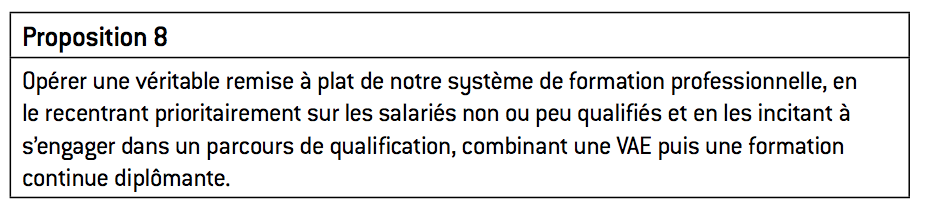 Face à ce constat, une politique de compétitivité doit prioritairement inciter les salariés peu ou non qualifiés à développer une qualification durant leur vie professionnelle, en leur permettant de valider au travers d’un diplôme les compétences acquises sur le terrain (mais non reconnues en dehors de leur entreprise) et en les incitant à suivre des formations diplômantes.