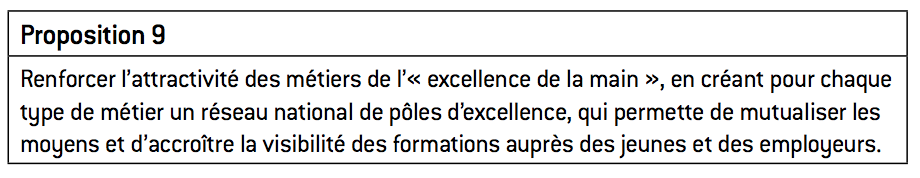 Les politiques récentes ont fortement valorisé les études longues et la recherche fondamentale, notamment au travers de l’autonomie des universités et des investissements d’avenir, dont les effets seront bénéfiques à long terme pour notre économie. Il est toutefois nécessaire de compléter cet effort par une valorisation accrue des formations appliquées et courtes, liées à ce que l’on appelle parfois l’« excellence de la main ». Les filières professionnelles et l’apprentissage ont longtemps pâti d’une image négative aux yeux du grand public, et tout particulièrement les filières industrielles. Trop longtemps, l’idée selon laquelle la réussite professionnelle passait par l’acquisition de connaissances abstraites et de diplômes de plus en plus élevés s’est largement diffusée et a pris appui sur un certain mépris envers les professions dites « manuelles ». On peut d’ailleurs constater qu’en France, trop longtemps, les formations débouchant sur les emplois d’ouvriers qualifiés étaient plutôt réservées aux élèves en difficulté scolaire, qui s’y trouvent le plus souvent orientés par défaut.