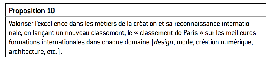Les parcours d’excellence ont longtemps été assimilés en France à l’univers fermé des grandes écoles et au seul registre de la formation intellectuelle, que ce soit dans le domaine scientifique, commercial ou des humanités. Au niveau international, les classements des écoles et universités es plus prestigieuses – à l’image du classement de Shanghai – n’échappent pas à cette règle : portés par la volonté de développer la « société de la connaissance », ils sont également opérés sur la base de critères d’excellence scientifique et académique, et n’incluent pas les formations à finalités pratiques. Par exemple, les meilleures formations mondiales dans des domaines comme la cuisine, Internet, le design ou l’architecture ne sont pas recensées dans ce type de classement. Il est temps de donner une meilleure visibilité internationale aux formations d’excellence dans les domaines de la créativité. Aussi, nous proposons que la France prenne l’initiative de lancer un « classement de Paris », classement international des meilleures formations et écoles supérieures aux métiers de la création. Le classement regrouperait un large domaine de formations telles que : les arts culinaires, le design, la mode, le cinéma, les jeux vidéo, l’architecture, etc. Ce classement permettrait à la fois de valoriser les formations françaises, souvent bien positionnées et de disposer d’un véritable benchmark de nos principaux concurrents, afin de mener des stratégies d’amélioration de notre offre.