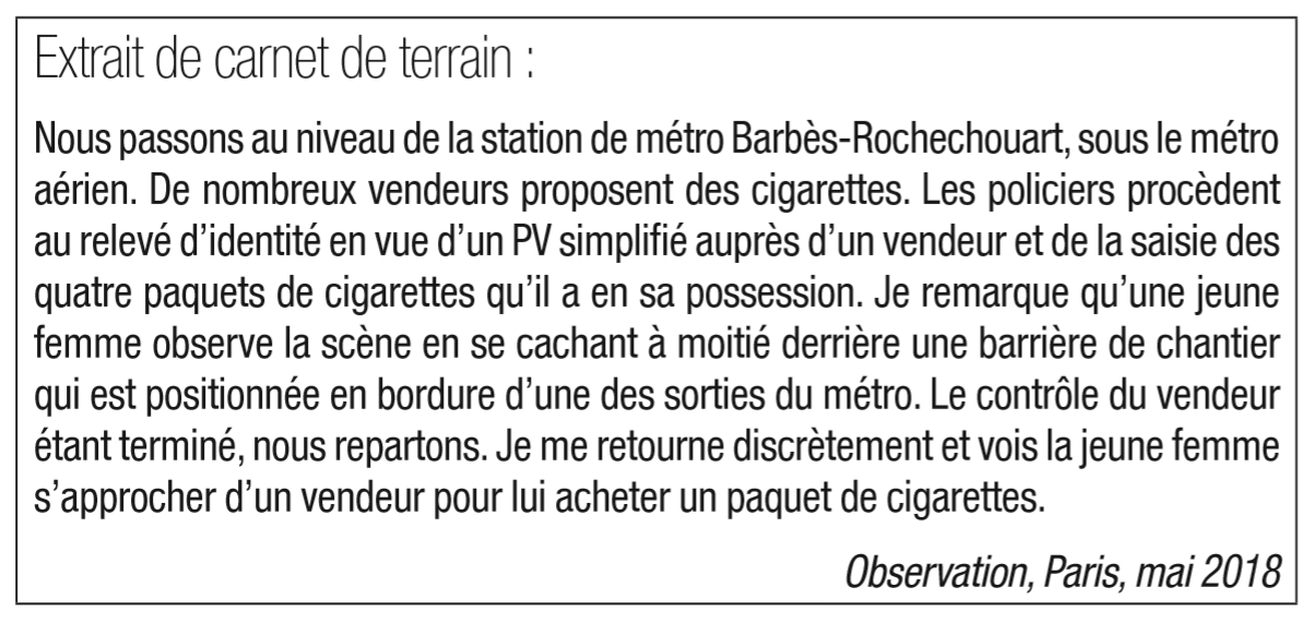 Un autre angle juridique utilisé par la police, là encore avant tout à Paris, est de traiter la vente à la sauvette, notamment celle de cigarettes, par le biais d’interpellations qui peuvent tantôt mener à des poursuites judiciaires, tantôt à une procédure administrative dans le cadre de la législation sur les étrangers. Depuis le lancement de la zone de sécurité prioritaire élargie dans les Xe et XVIIIe arrondissements, des opérations répétées regroupant différentes unités de voie publique de la DSPAP contre les revendeurs de cigarettes ont été mises en place à Barbès et à La Chapelle. Elles consistent à mener des interpellations en nombre de ces vendeurs, après avoir avisé le parquet au préalable et avoir bloqué des places de garde à vue dans les services judiciaires. Le but est double. Tout d’abord, il s’agit d’identifier et réprimer les récidivistes, afin de les renvoyer devant le tribunal et d’obtenir des interdictions de paraître sur les lieux. Par ailleurs, les revendeurs de produits du tabac étant fréquemment des étrangers en situation irrégulière46, il est également possible de les traiter sous cet angle en vue d’obtenir un transfert au centre de rétention administrative et une éventuelle expulsion du territoire national. Au moment où l’entretien avec le coordinateur de ces opérations a été mené (mai 2018), 260 interpellations de ce type avaient été menées depuis le lancement de la zone de sécurité prioritaire élargie. Cette dernière approche par les infractions à la législation sur les étrangers est également appliquée en Seine-Saint-Denis, mais de manière plus ponctuelle, aussi bien sur les lieux de vente que sur les foyers qui hébergent ces revendeurs.