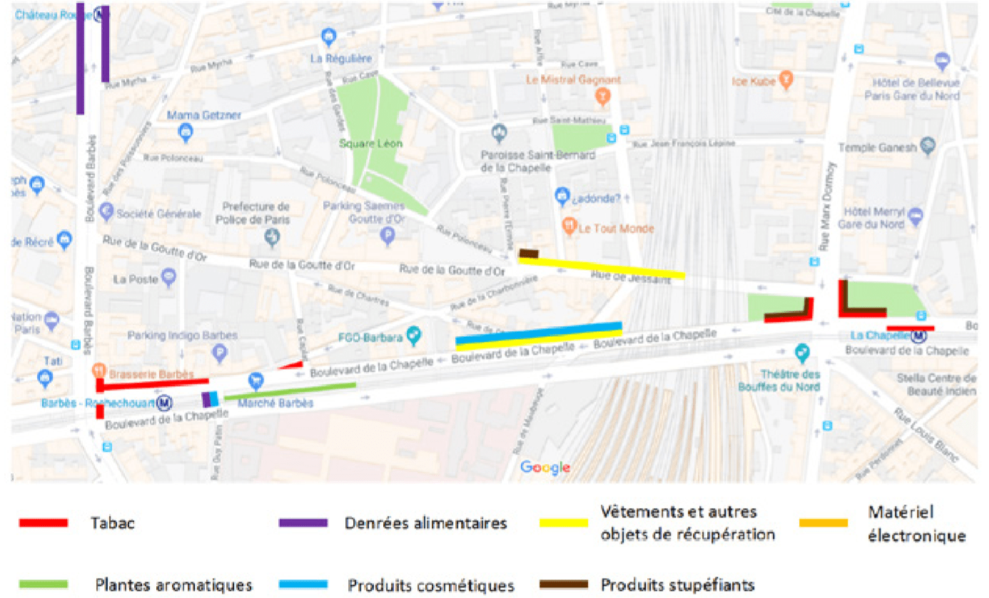 Cette stratégie est principalement appliquée à Paris au problème dit de « sauvette de masse », à savoir l’occupation généralisée de l’espace public dans certains quartiers comme la porte Montmartre, Château-Rouge41 ou encore la porte de Montreuil par des étals sauvages de denrées alimentaires ou d’objets de récupération, souvent en marge de marchés ou de commerces légaux (voir partie I.2.), générant ainsi des externalités très pénalisantes pour les riverains (impossibilité de circuler sur les trottoirs, bruit, salissures).