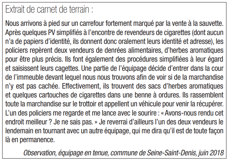 Comme le résume un policier de Seine-Saint-Denis interrogé dans le cadre de cette étude : « On fait des tas de procédures simplifiées, qui d’ailleurs feraient sans doute l’objet de procédures plus sérieuses si on était ailleurs, mais rien ne change ou presque. Ça déplace et ça dissuade le temps de notre passage49. »