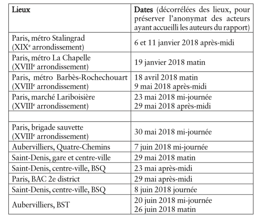 En outre, il faut ajouter que le quartier de La Chapelle fera partie des trente premiers « quartiers de reconquête républicaine » annoncés le 8 février 2018 dans le cadre du lancement de la police de sécurité du quotidien et bénéficiera de ce fait de renforts supplémentaires à compter de janvier 201944. Néanmoins, comme on le verra plus loin, ce renforcement de la stratégie d’occupation de l’espace public par la préfecture de police concerne avant tout le XVIIIe arrondissement de la capitale, les deux autres sites étudiés dans le présent rapport ne bénéficiant pas des mêmes apports en effectifs.