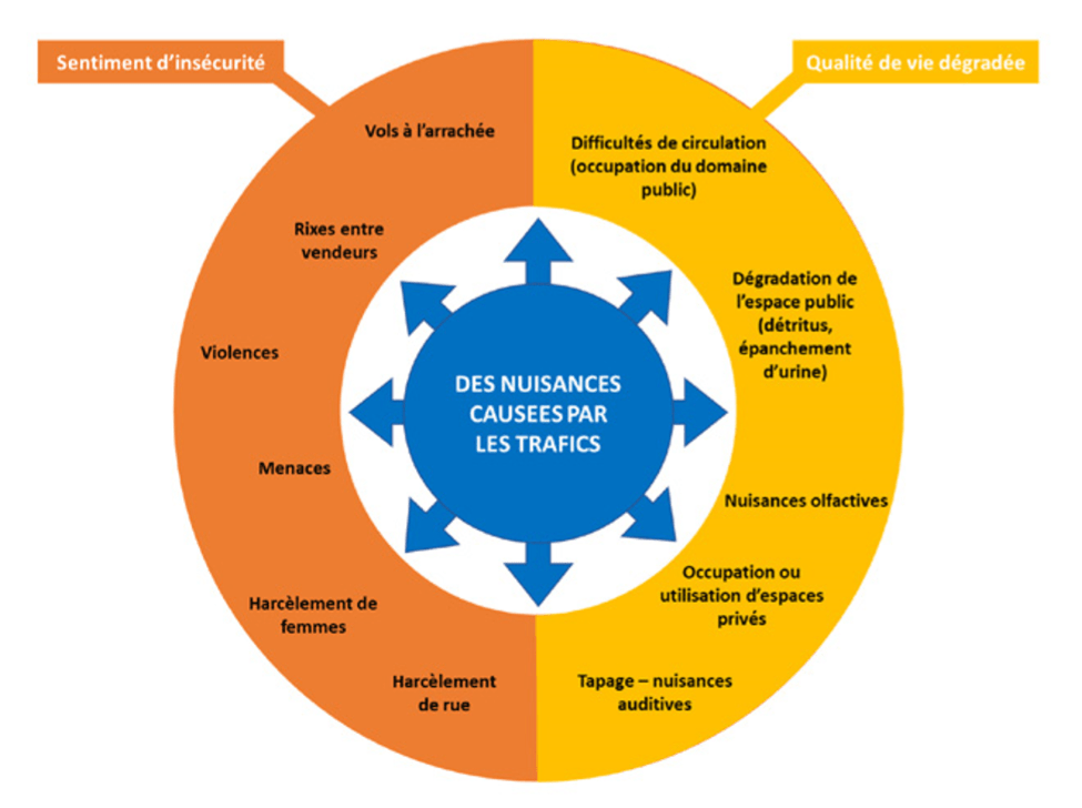 Les différents terrains, en particulier La Chapelle et la gare de Saint-Denis, montrent à quel point l’installation du commerce illicite sur un territoire révèle, voire initie un processus de perte progressive de contrôle d’un territoire. Il précède ou accompagne une dégradation de la qualité de vie pour les riverains, ainsi que l’escalade vers des phénomènes plus graves (harcèlement, rixes entre vendeurs, vols à la tire…). L’étude montre que, d’abord isolés, les étals ou points de vente illicites ont tendance à essaimer si la puissance publique ne réagit pas, envoyant ainsi une forme de signal à des trafiquants et délinquants plus aguerris qu’un espace n’est pas tenu par les garants de l’ordre public. Là encore, des messages clairs doivent être diffusés auprès du grand public sur le fait que, loin d’être un phénomène en apparence anodin, il s’inscrit dans une problématique plus globale de maîtrise d’un certain nombre de territoires par la puissance publique et d’égalité des citoyens devant la loi.