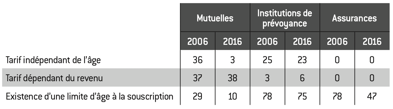 On remarque par ailleurs l’effet de la concurrence sur l’évolution des modes de tarification : alors que 36% des tarifs des contrats individuels proposés par les mutuelles étaient indépendants de l’âge en 2006, ils n’étaient plus que 3% en 2016 (voir tableau 3). En effet, un jeune en bonne santé, qui présente moins de risque pour l’assureur que la moyenne, aura intérêt à souscrire à un contrat qui fixe une prime au plus près de son risque individuel car le tarif sera plus avantageux. Les organismes qui pratiquent la tarification à l’âge disposent donc d’un avantage concurrentiel par rapport à celles qui sont attachées à la solidarité intergénérationnelle. En conséquence, la solidarité intergénérationnelle tend à disparaître sur un marché concurrentiel dérégulé.